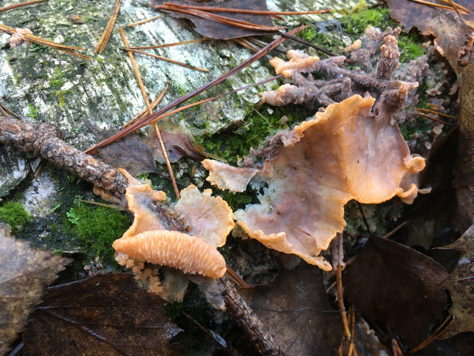 Pilz 3 in Gesellschaft mit obigem Glibber: zB der Krause Adernzähling (Plicaturopsis crispa)