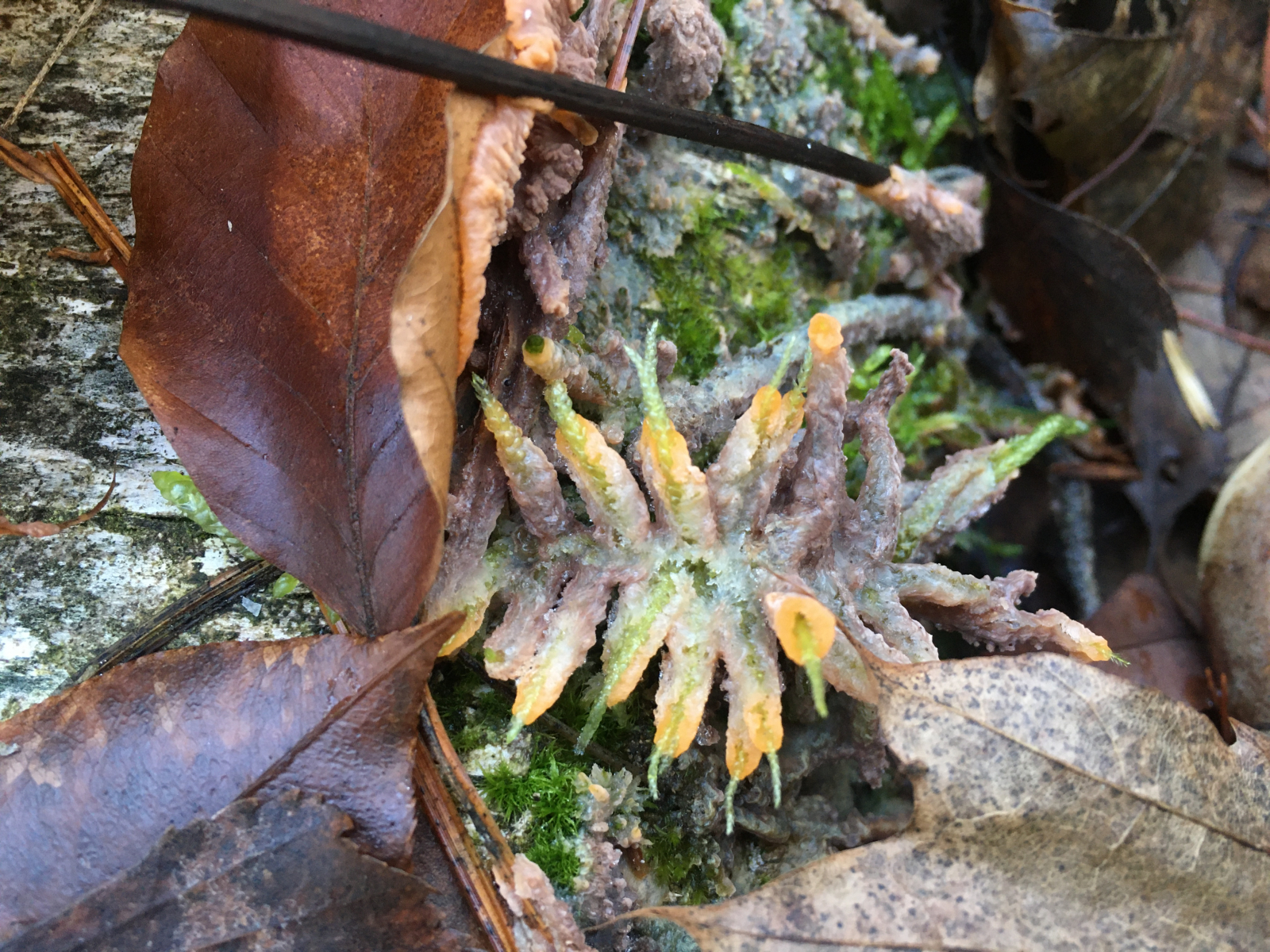 Die Phlebia radiata (Orangeroter Kammpilz) lebt höchstwahrscheinlich in dem Birkenstamm, nicht in den kleinen Nadelholzzweiglein und Blättern. Diese kleinen Strukturen benutzt er nur als Gerüst für die Fruchtkörper, ebenso wie die Moose auf dem Stamm.