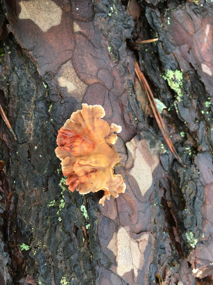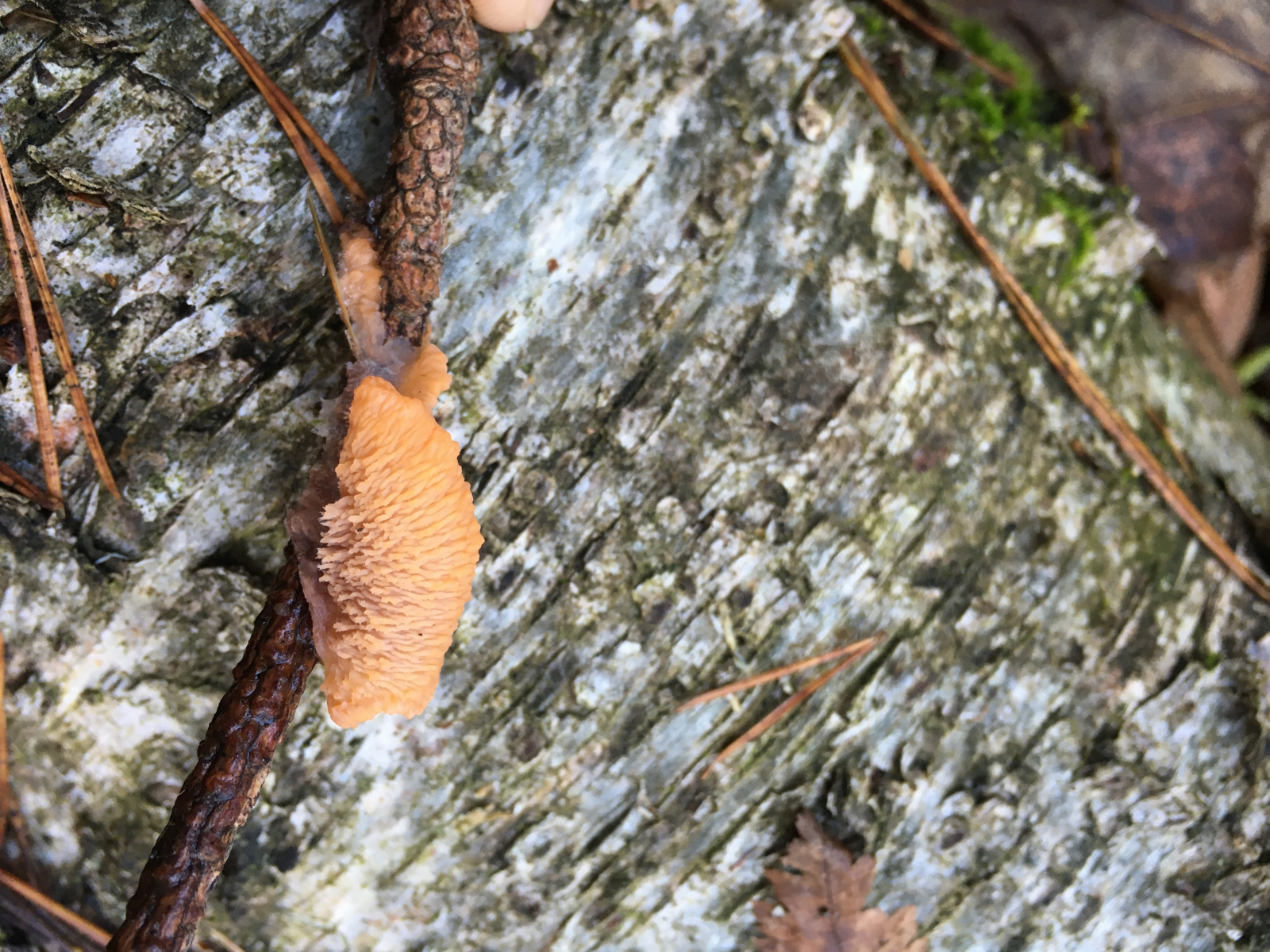 Pilz 5 an Nadelholz, liegend zB der orangerote Kammpilz (Phlebia radiata) auf Wanderschaft