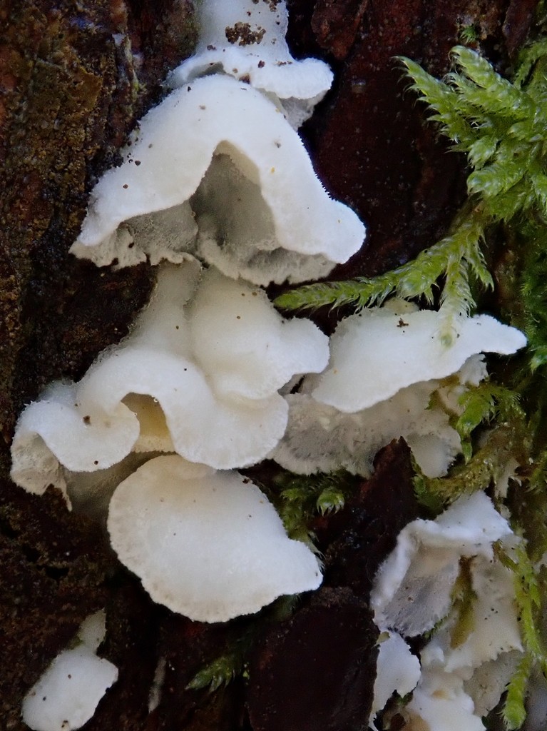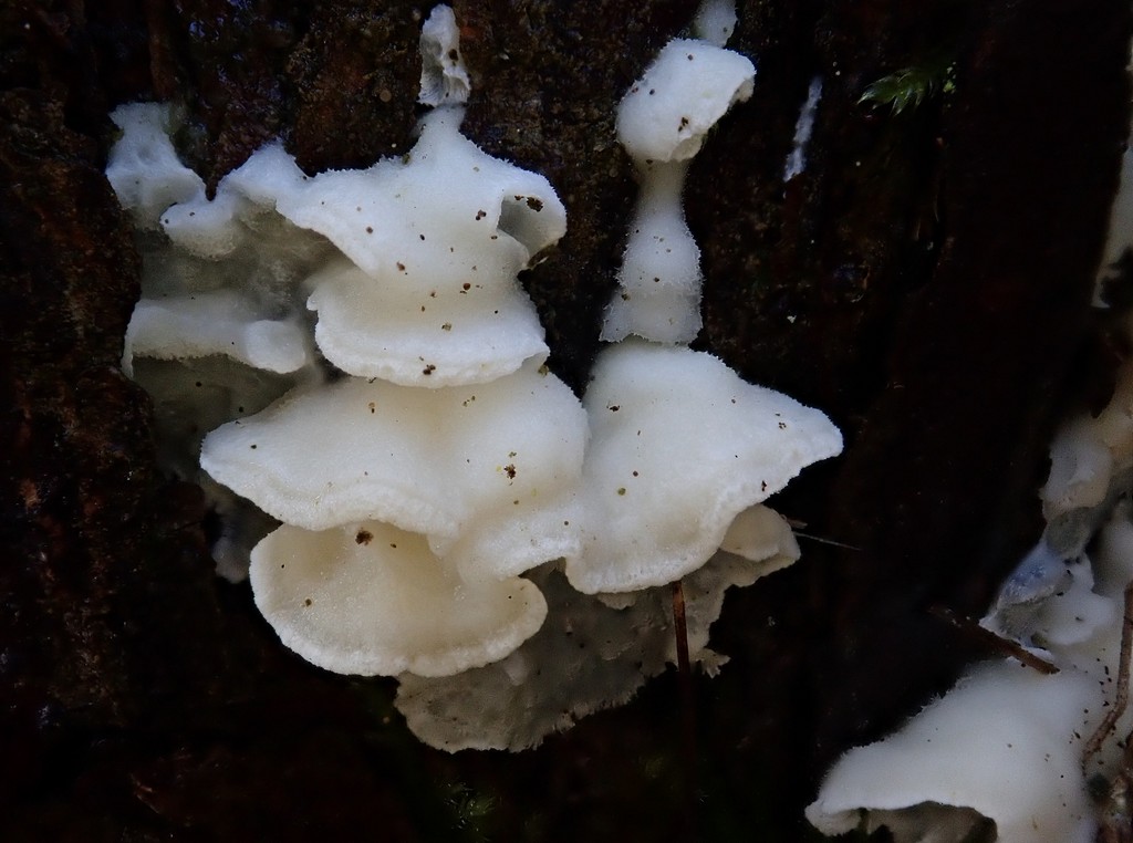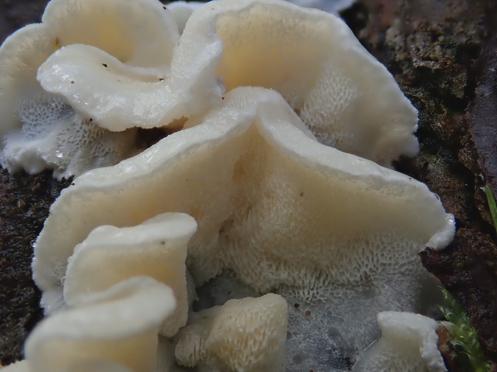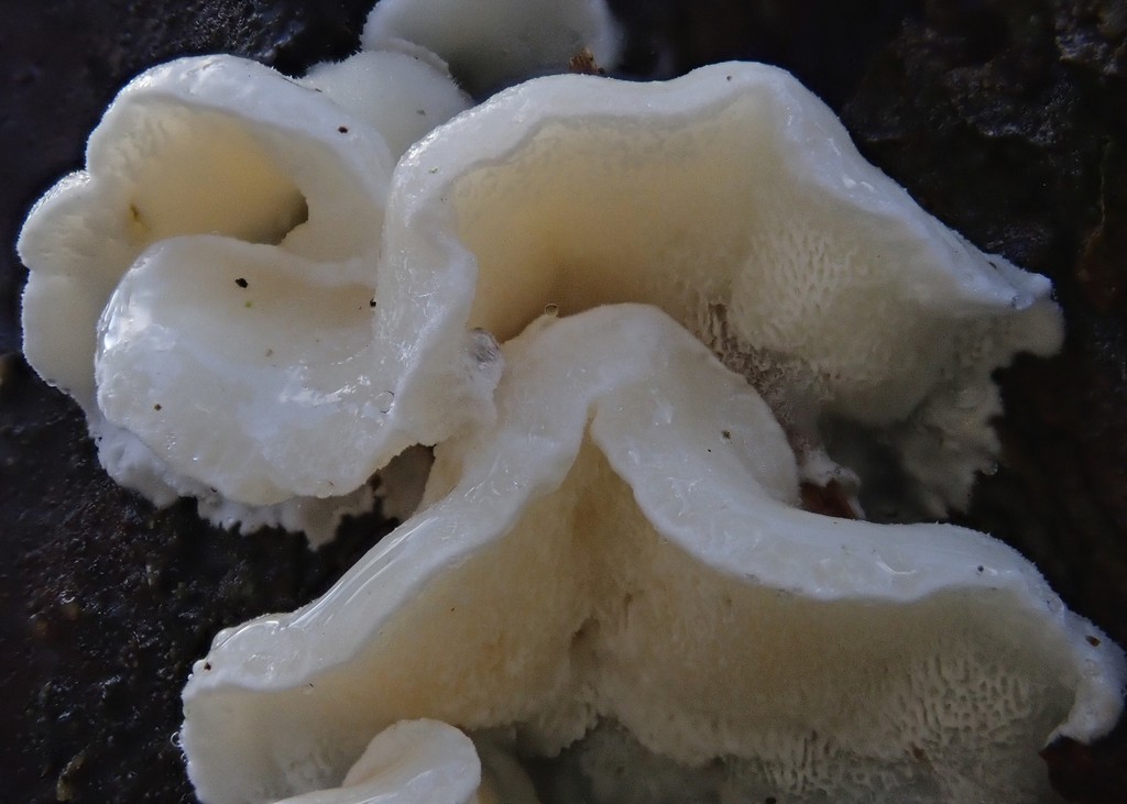 Einzelhüte bis 30 mm breit und 10 mm abstehend, wellig, elastisch-zäh, Hüte neben- und untereinander und wie gesagt am Substrat herablaufend.