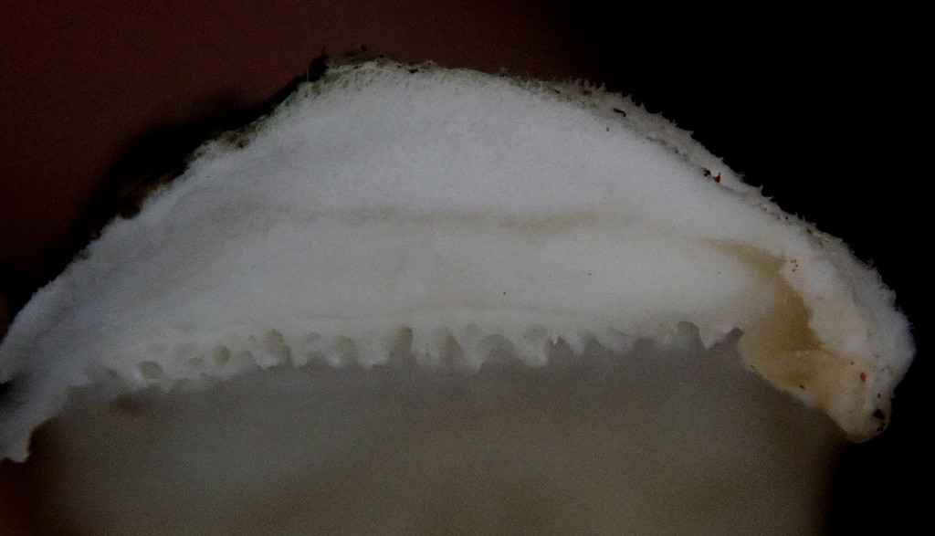 Im Gegensatz zu den schon sehr früh im Hintergrund der Porenschicht pigmentierten Skeletocutis amorpha ist mir carneogrisea auch schon fast weiß begegnet - allerdings nur beim Einsammeln. Beim Rumliegenlassen / Antrocknen mit markanter Veränderung; da wurden die zuvor ganz hellen Fruchtkörper rasch dunkel. Und zwar nicht nur die gelifizierte Schicht, sondern auch der Hutfilz.