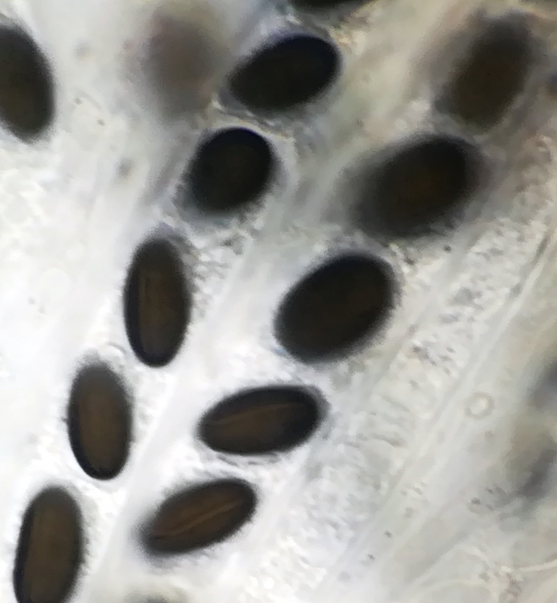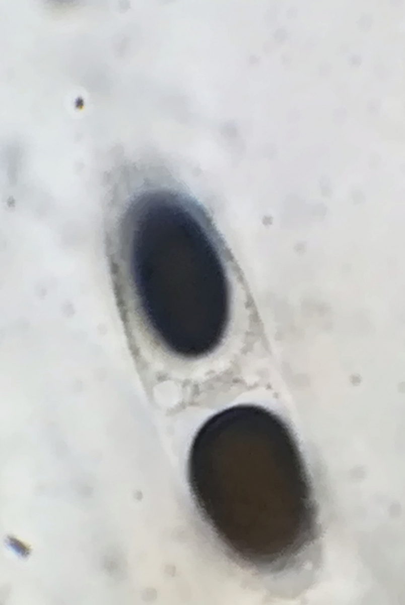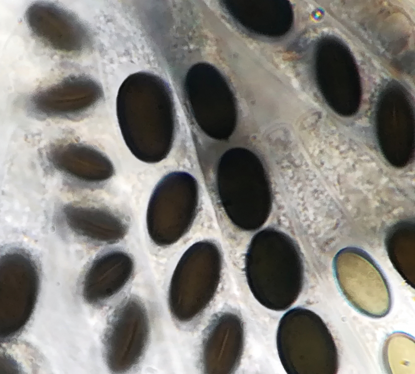 - Die Sporen habe ich mit 9,5 - 10,7 x 7 - 8,5 x 5 - 5,7 µm gemessen. Sie sind von einer dicken Gelhülle umgeben und die Keimspalte zieht sich über die komplette Länge der Sporen
