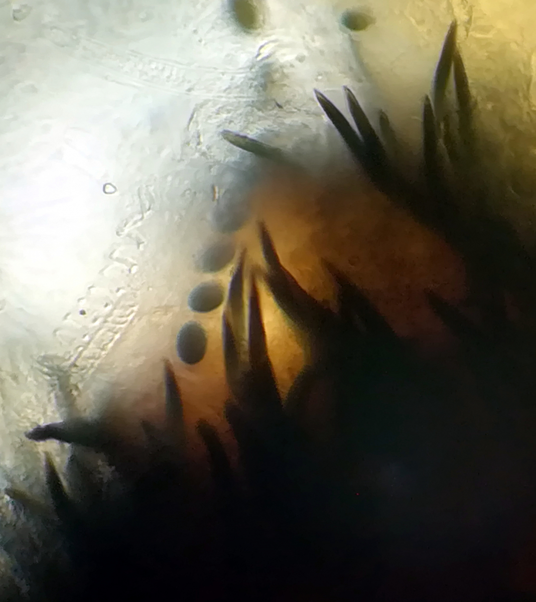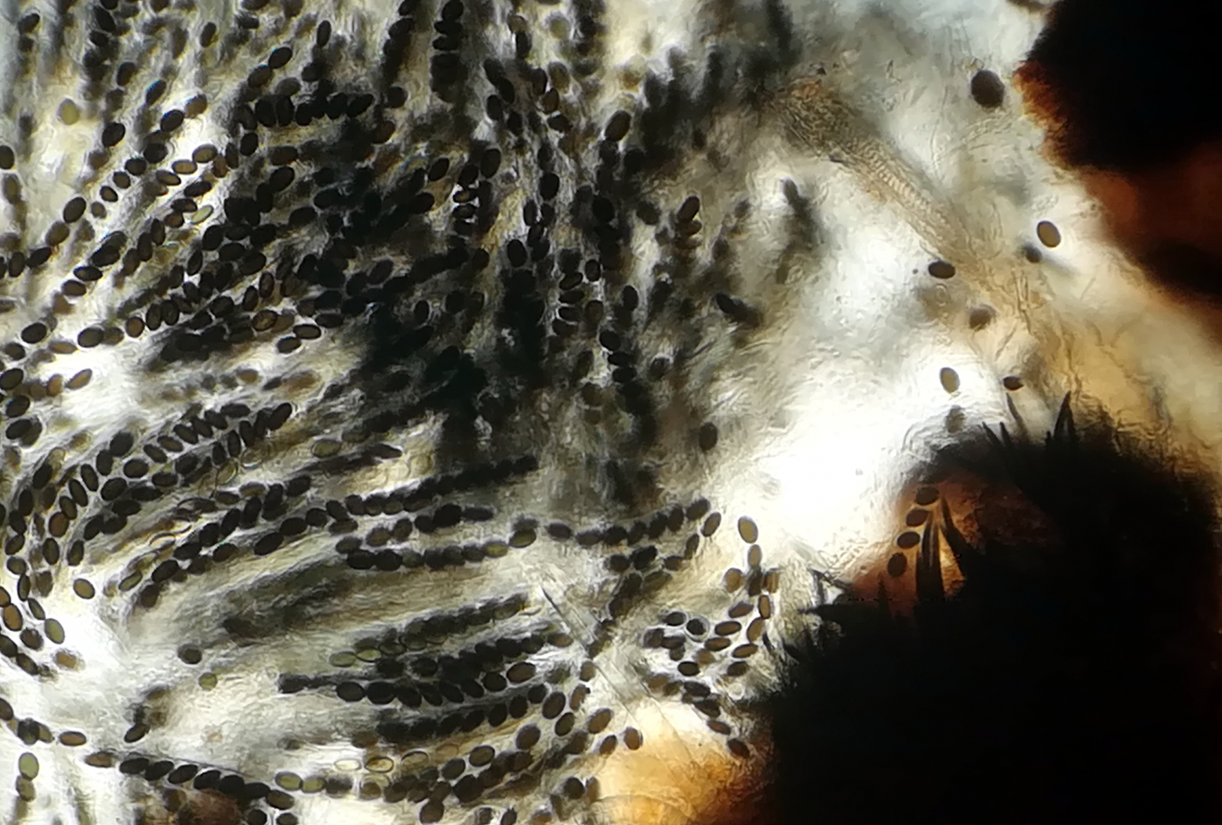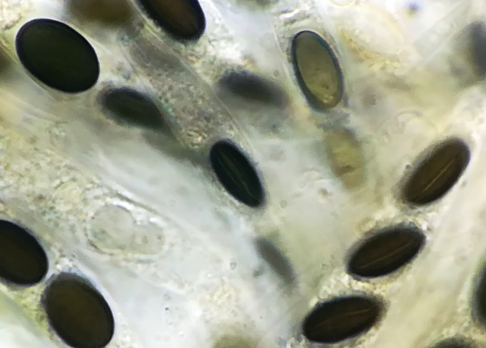 - Die Sporen habe ich mit 9,5 - 10,7 x 7 - 8,5 x 5 - 5,7 µm gemessen. Sie sind von einer dicken Gelhülle umgeben und die Keimspalte zieht sich über die komplette Länge der Sporen