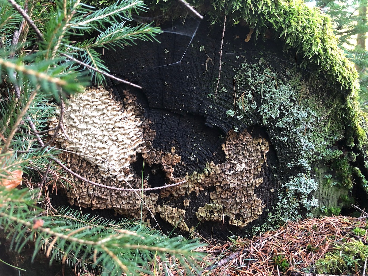 Die Antrodia war voriges Jahr noch ganz schick. Jetzt hat sie wohl ihr Substrat weitgehend vertilgt.