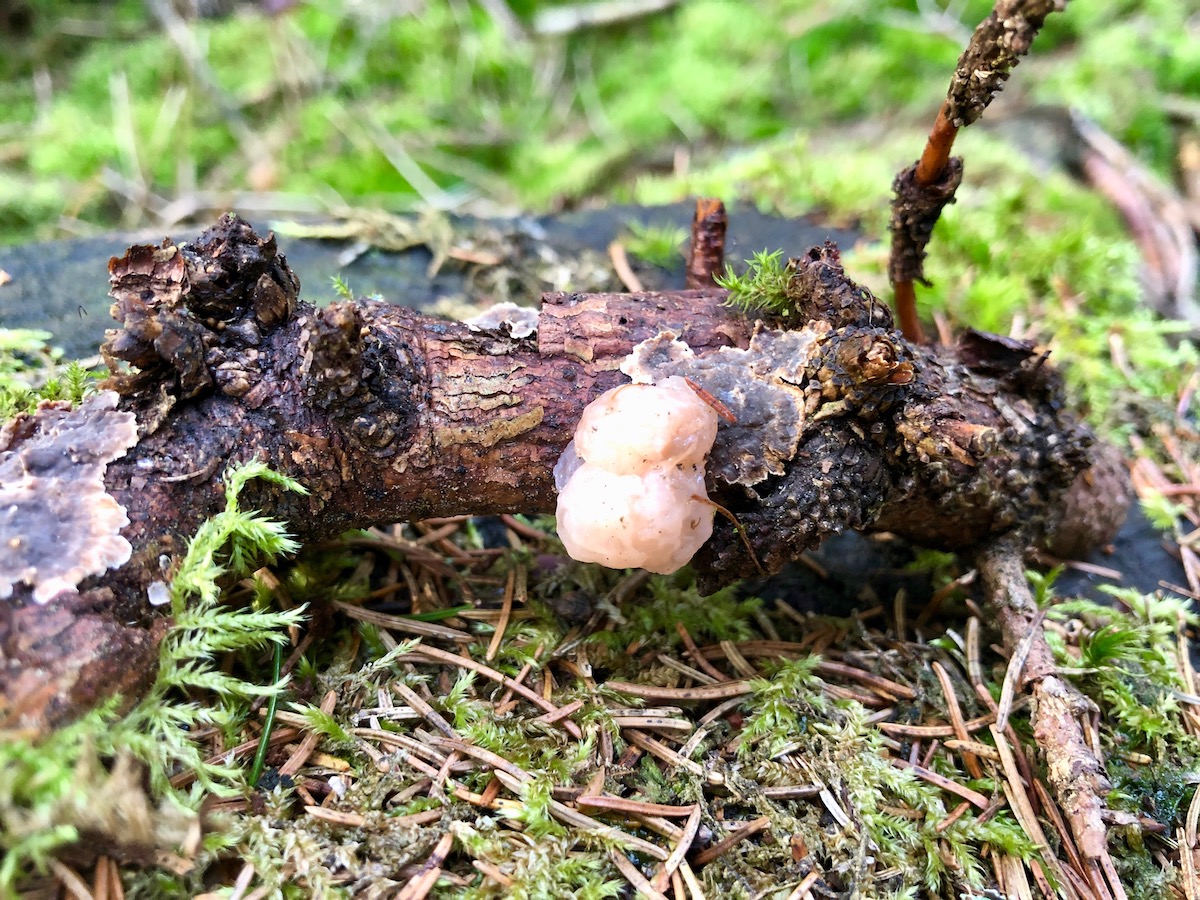 Das ist wohl der parasitisch auf einem Schichtpilz lebende Weißkernige Zitterling.