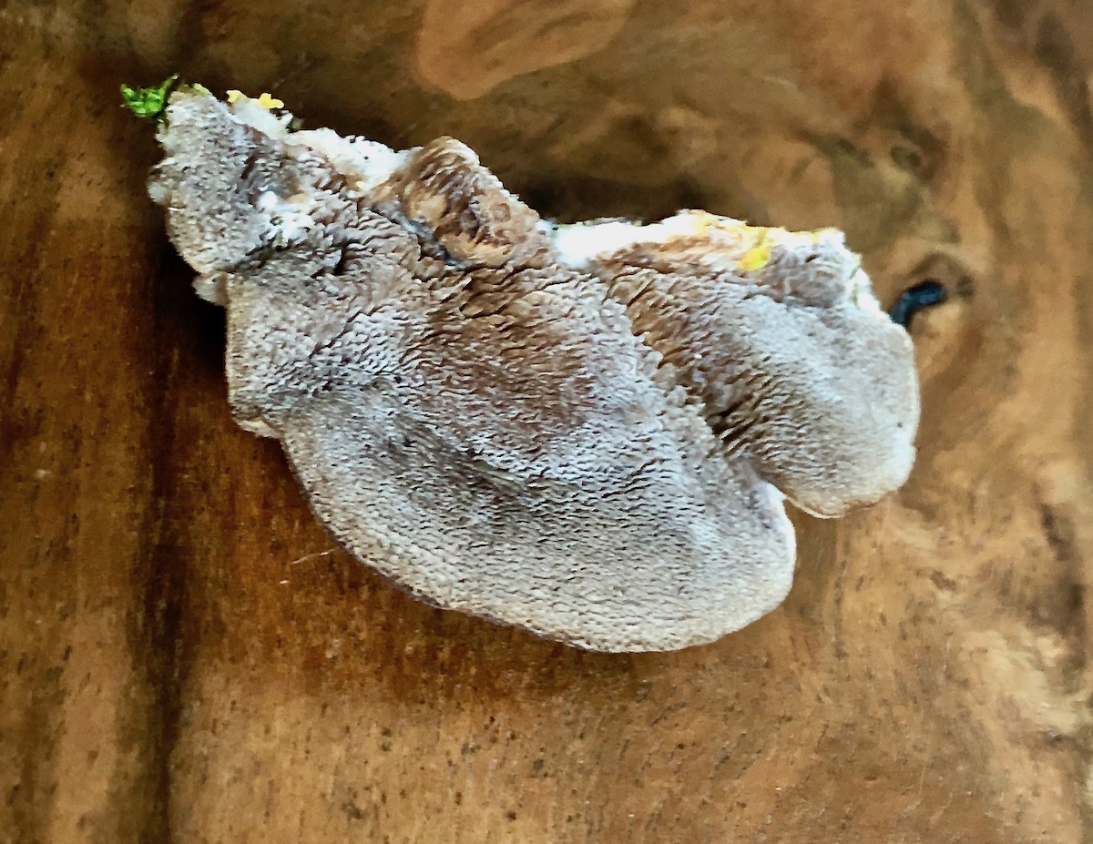 Bei dem hier brauche ich Eure Hilfe, ca. 4 cm breit an Erle. Er wuchs so weit über meinem Kopf an einem abgestorbenen Ast, dass ich ihn nicht vor Ort fotografieren konnte. Aber der Wohnzimmertisch sieht ja auch ein bisschen aus wie im Wald. Kleinsporiger Knorpelporling heißt ein Pilz im Bon, der ihm am nächsten kommt. Aber wir Poren sieht das unten drunter eigentlich nicht aus.