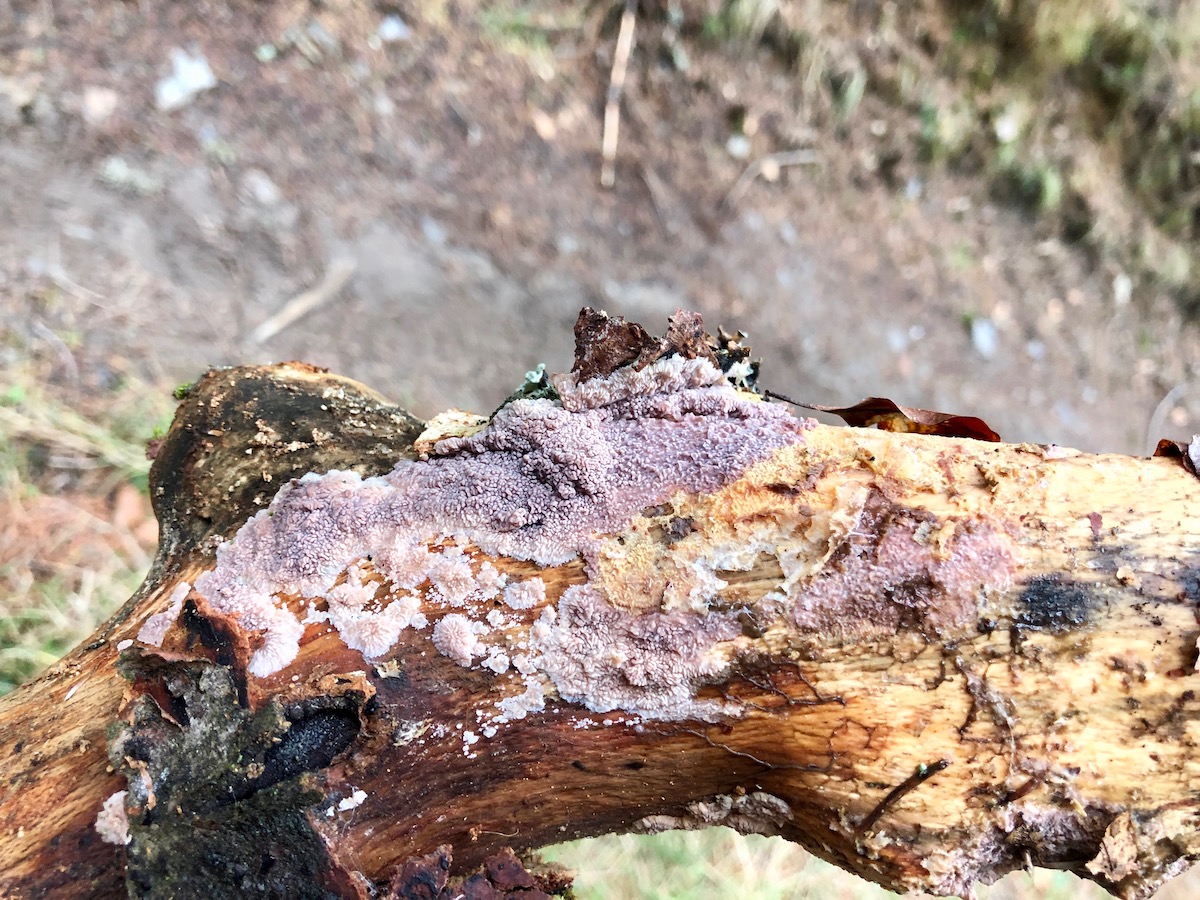 Das sind die Überreste eines seit zwei Jahren an einem Ebereschenast wachsenden Reibeisenrindenpilzes. Ich finde ihn erstaunlich gut erhalten nach diesem Sommer.