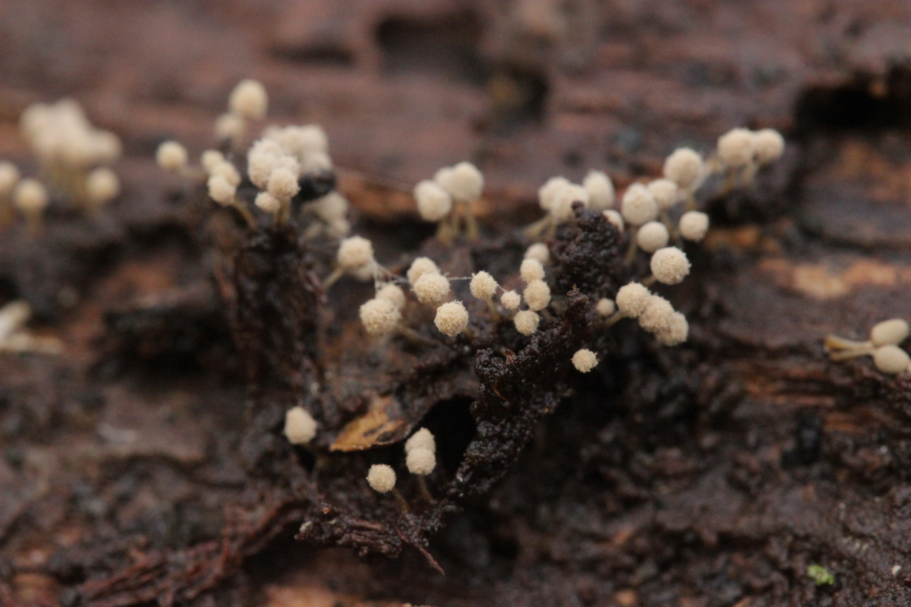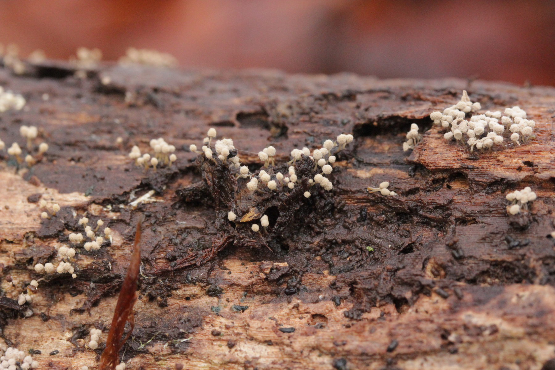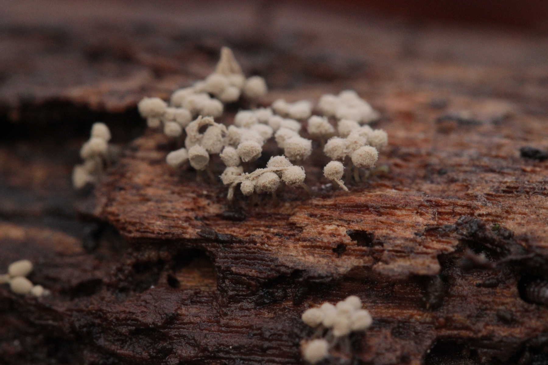 Die Grauen würde ich beide für Arcyria cinerea halten, wenn auch bei der zweiten Kollektion seltsam gewachsen. Ich weiß es auswendig nicht genau, aber ich meine, dass das feinstachelige Capillitium zu der Idee passt.