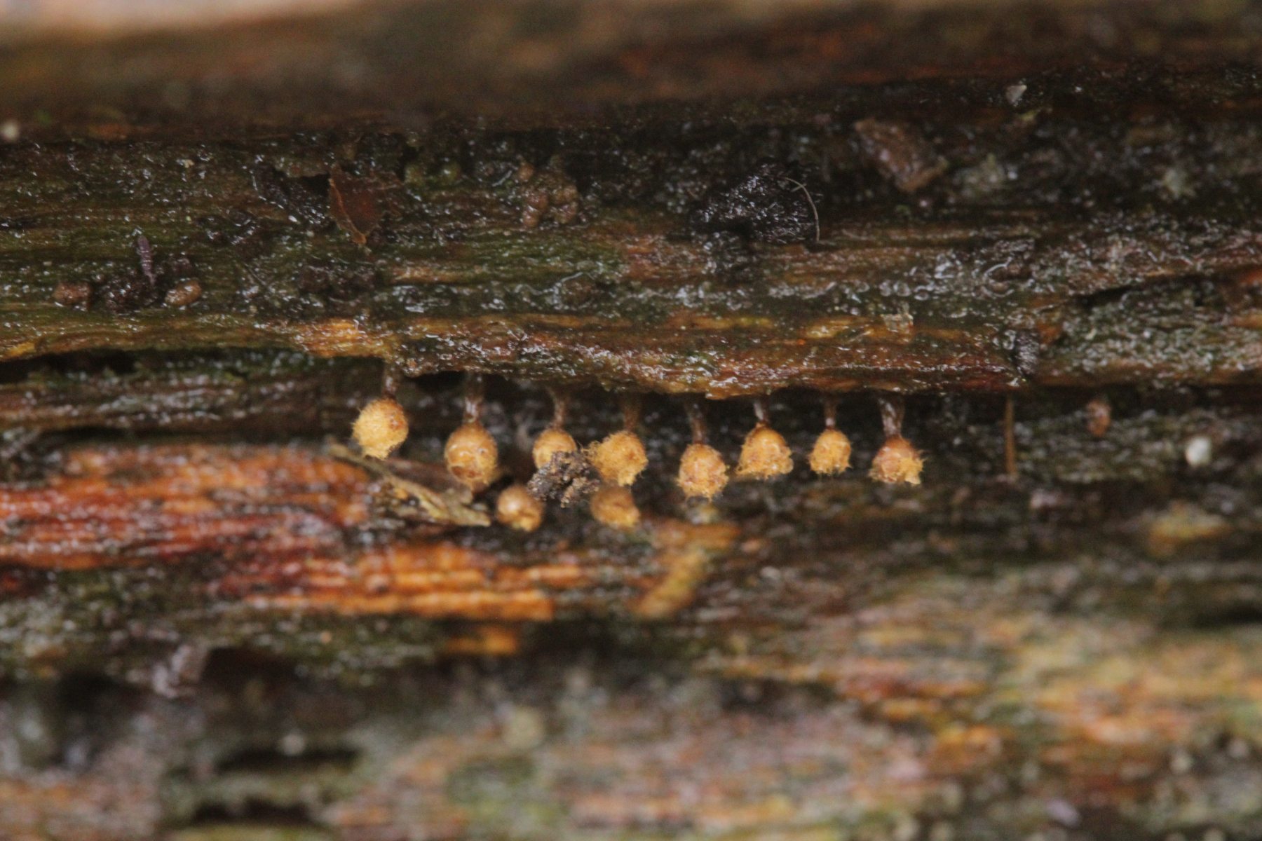 Es kommen da nur wenige Arten in Frage. Leider hast Du ja kein Makrofoto mitgeliefert. Ich tippe mal so ins Blaue rein: Trichia botrytis, die hat solche langen Enden des Capillitiums und die Sporen sind nur feinwarzig.