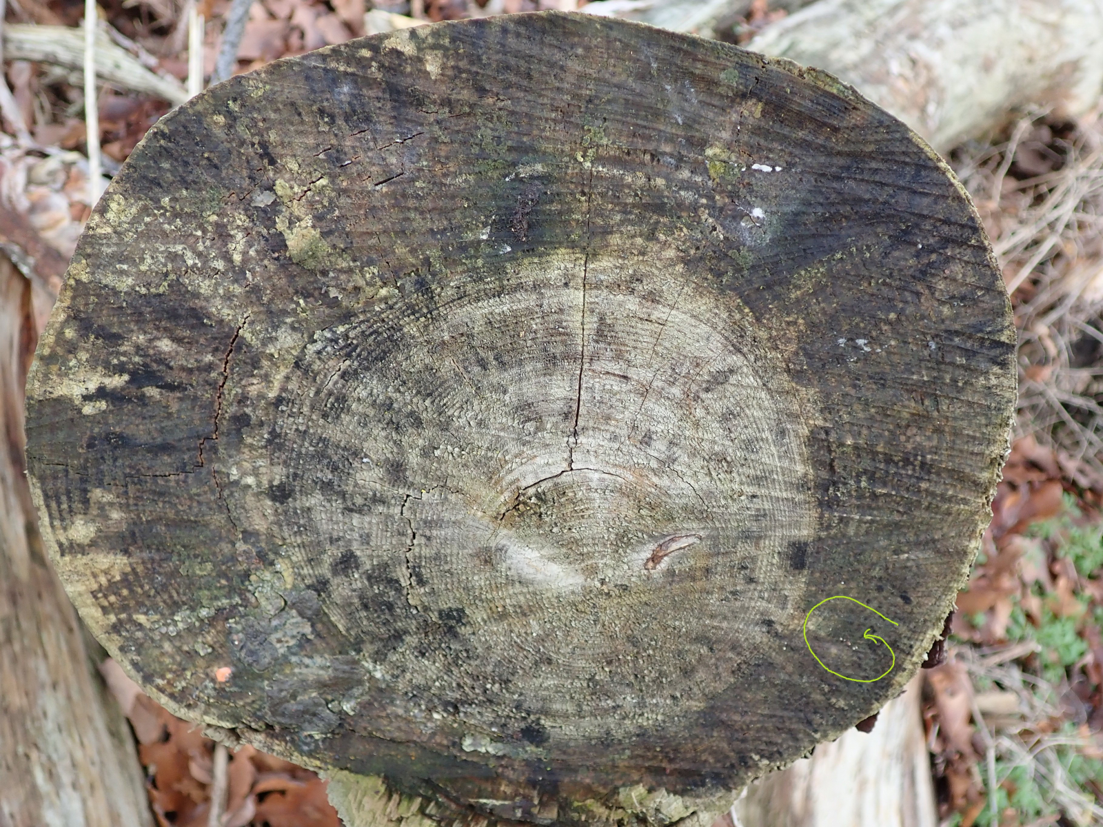 2 dicker Ast aus einer Kiefernkrone, ca. 30cm Durchmesser, grün umkringelt die Schleimpilze