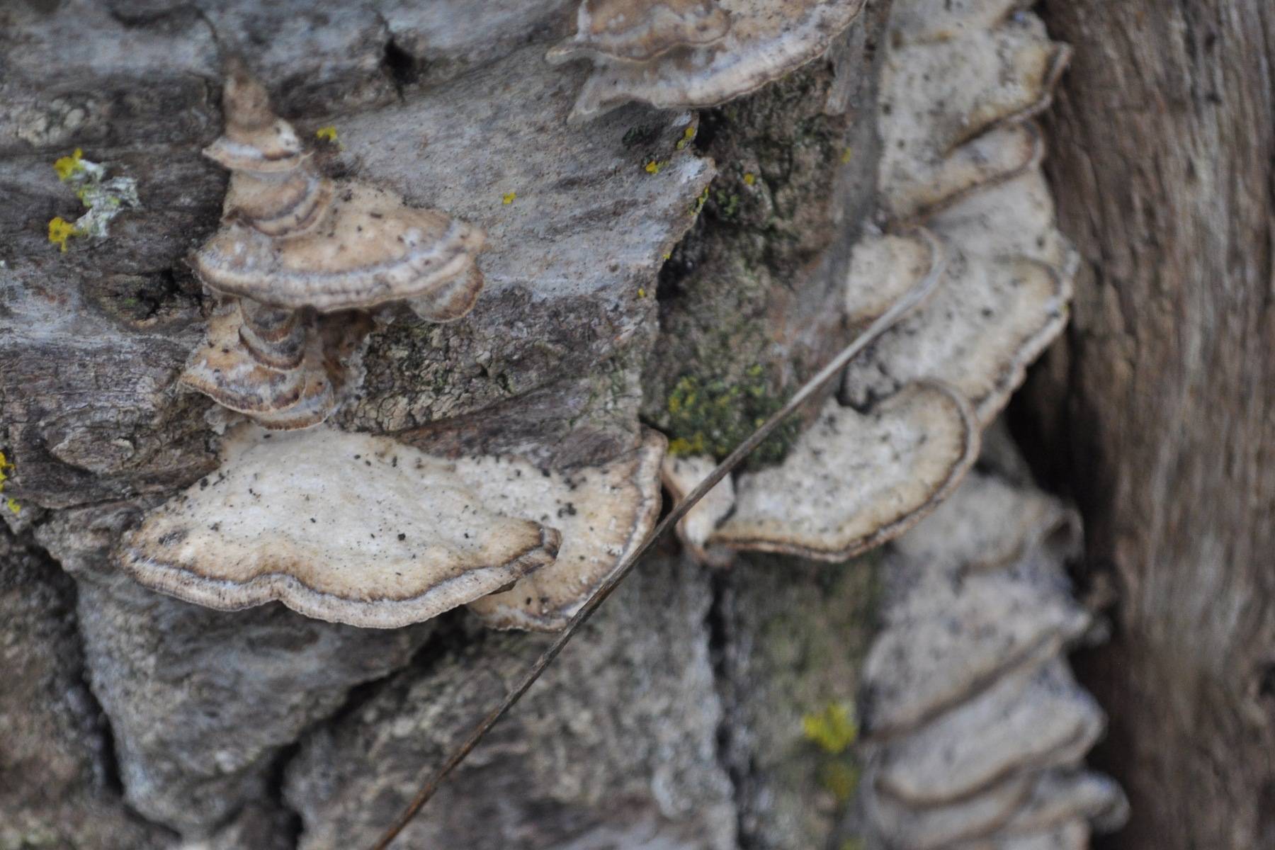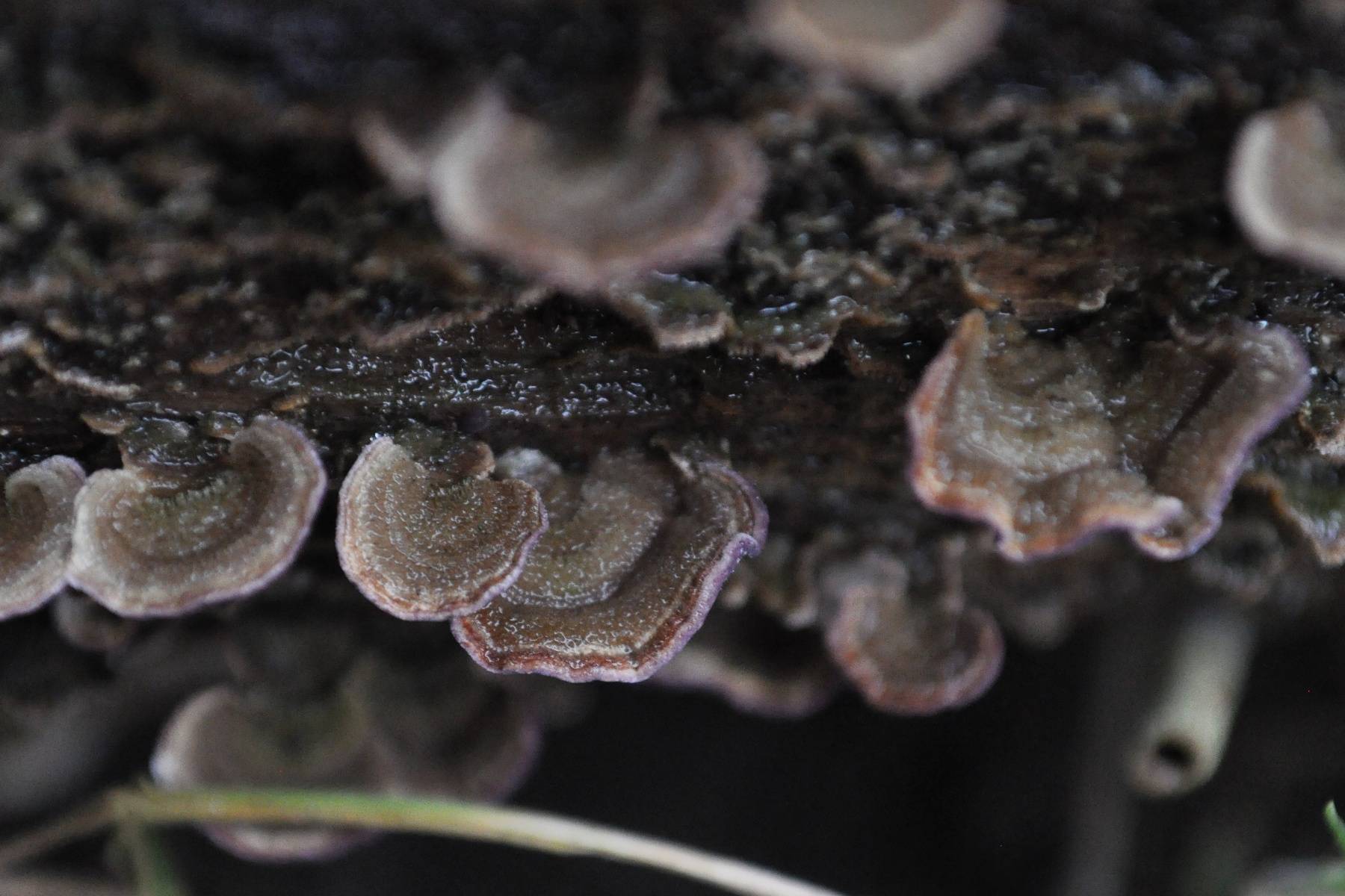 Nr. 3 wächst in der Tat am selben Holz wie der Trichaptum - ein Stück Kiefernstamm, das ich mir eigentlich als Nistsubstrat für solitäre Wespen und Bienen besorgt habe.