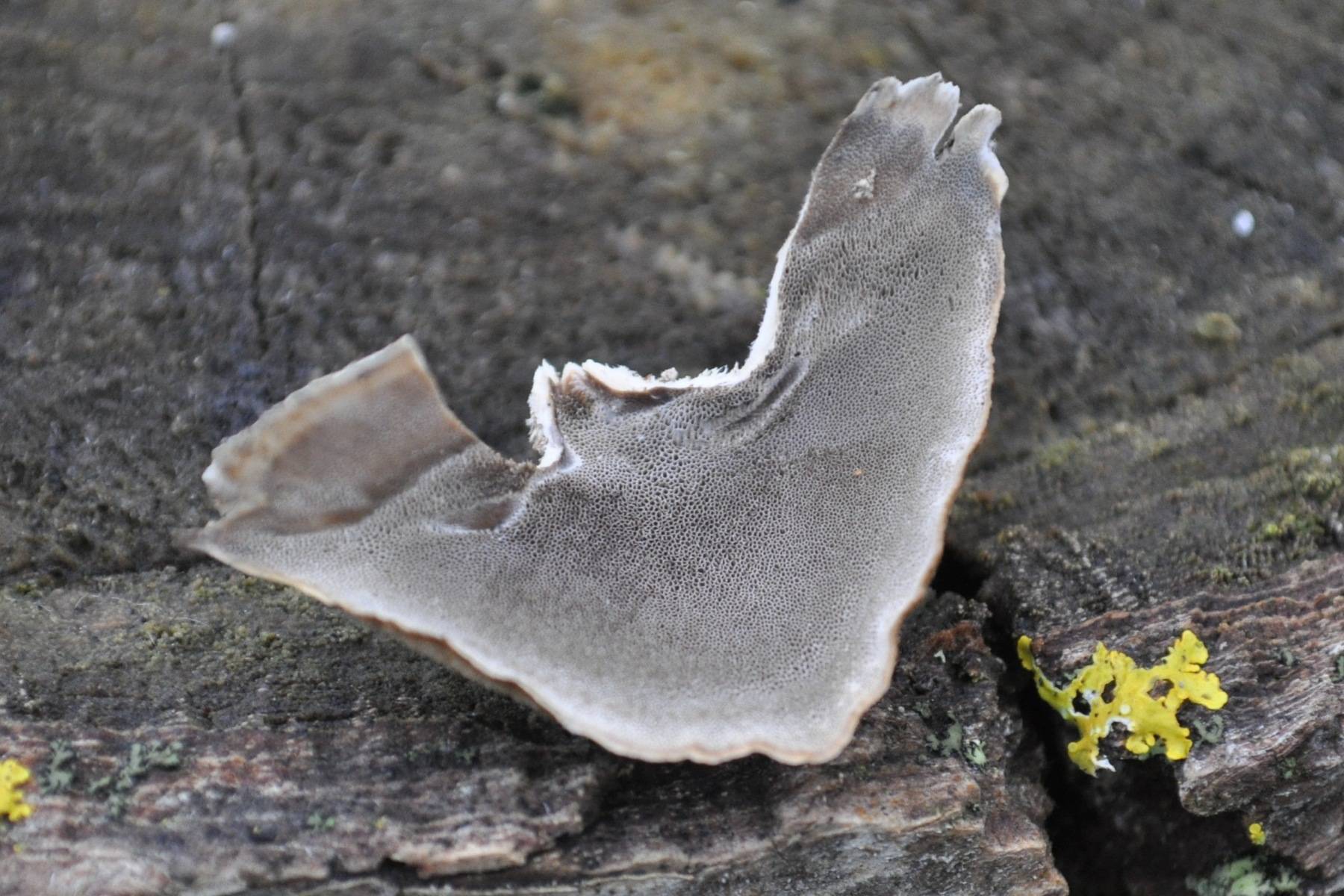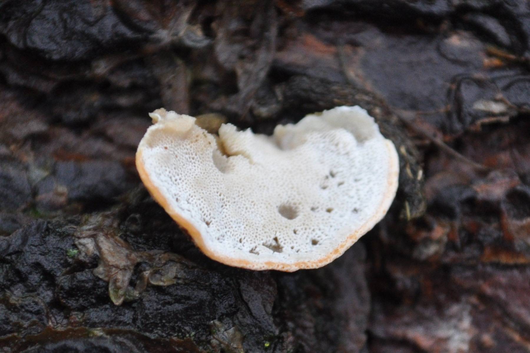 Etwas wunderlich wäre für Skeletocutis die Wuchsform mit der knubbelig verdickten Ansatzstelle. Skeletocutis amorpha und carneogrisea wachsen ja eigentlich viel lieber effus reflex, dann sieht die Ansatzstelle schon anders aus. Das wäre für mich wohl ein Porling, den ich wohl selbst mit Pilz in Hand (Konsistenzen, Haptik, Aussehen im Schnitt direkt vergleichen können) noch mikroskopisch anschauen würde. Je nach Konsistenz kann es auch Trametes sein (einige Arten können da acuh mal an Nadelholz gehen), oder aus der Ecke Oligoporus s.l., oder auch noch mal was anderes...Schwierig, und ausschließen möchte ich Skeletocutis auch erstmal nicht.