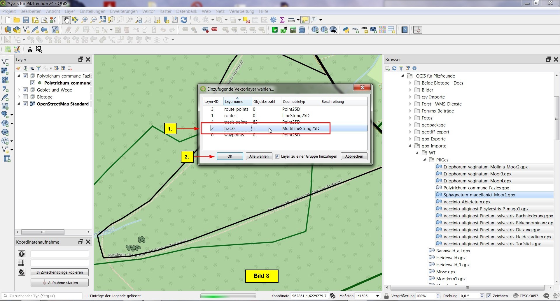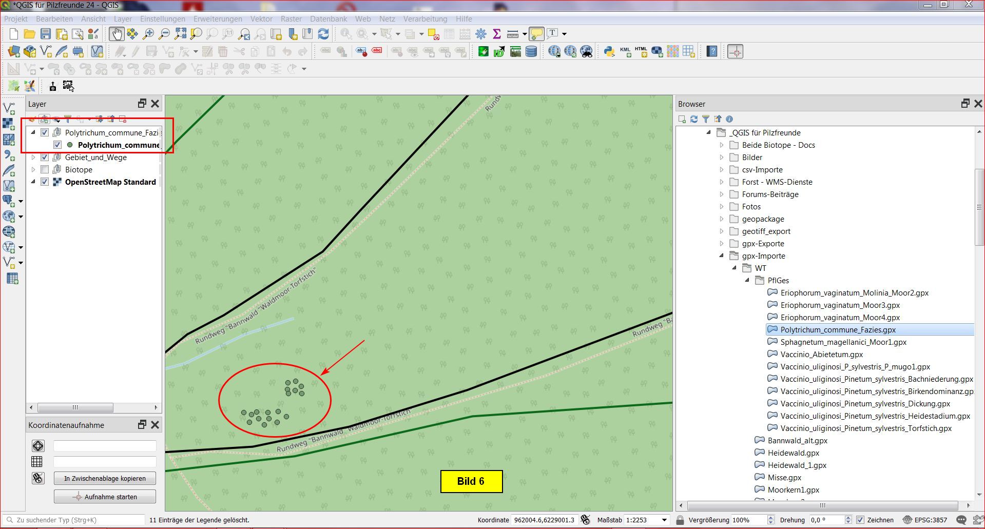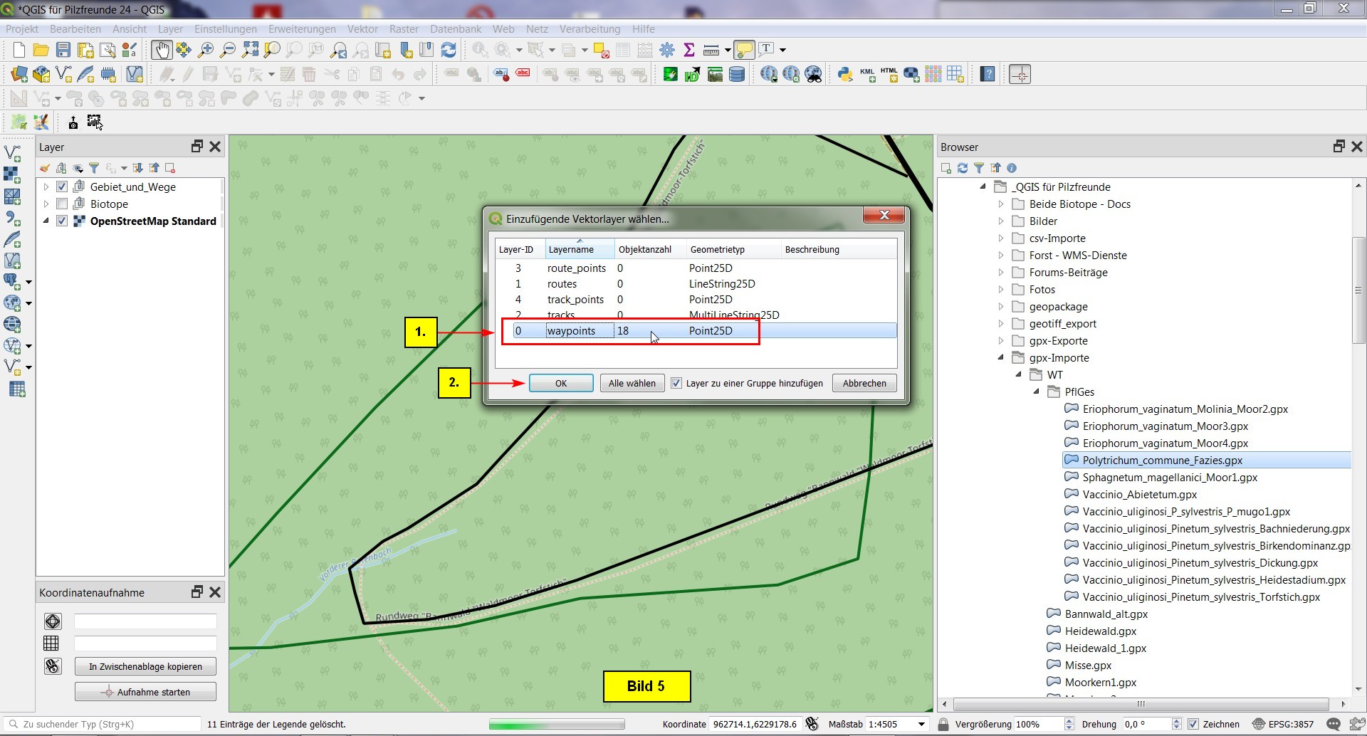 Das Layer Polytrichum_commune_Fazies ist ein Punktlayer, d.h. es muss im Dialog waypoints selektiert werden!