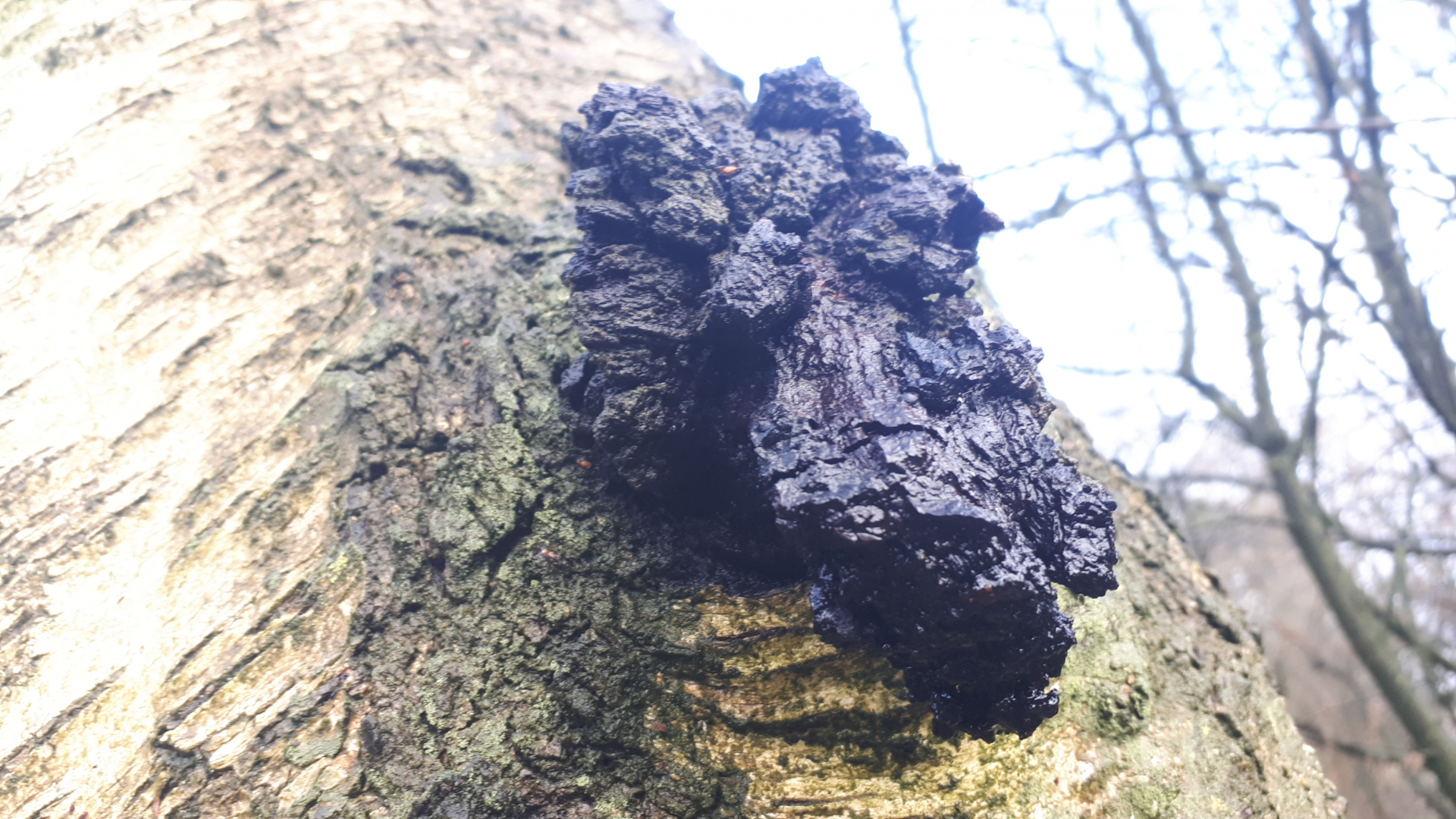 Pilz 7: Die ersten Fruchtkörper, an der stehenden Birke vermutlich schon, die anderen könnten auch eine Wucherung sein.