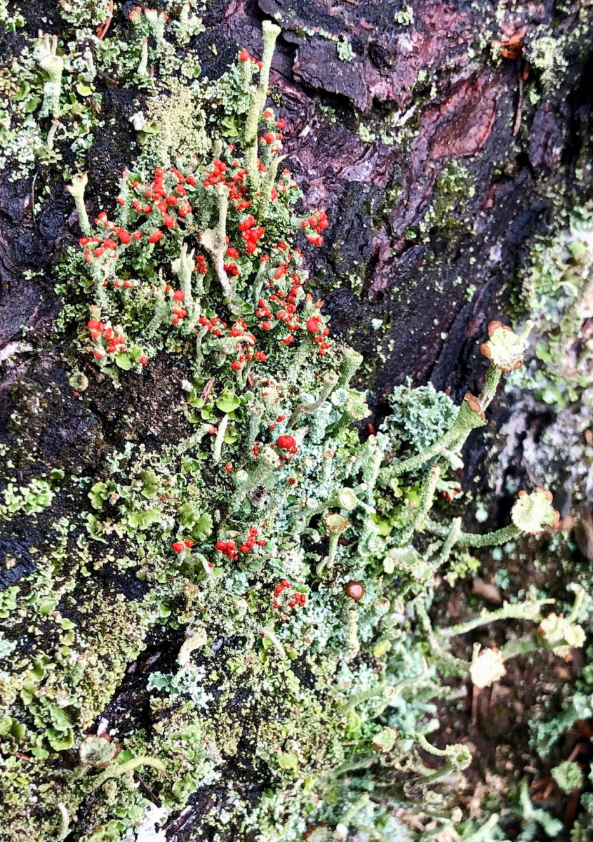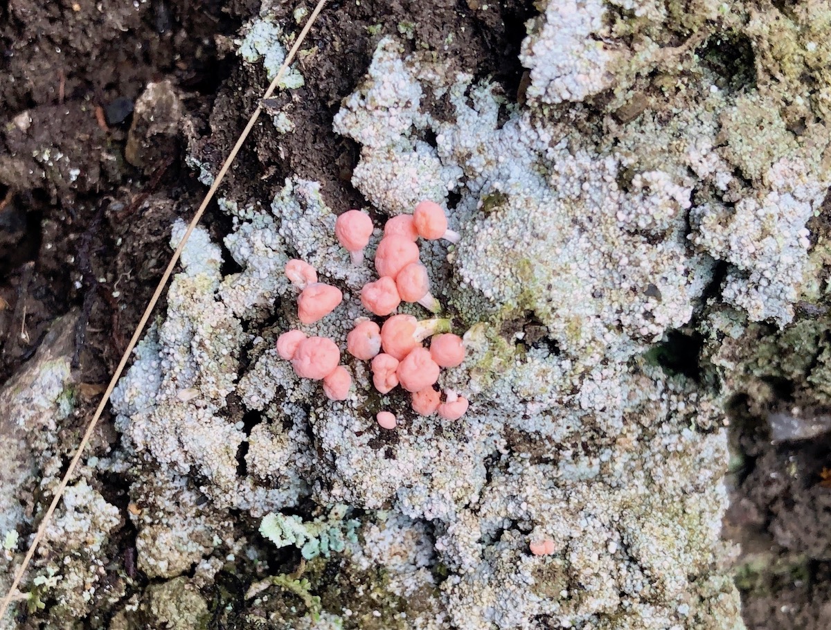 Die Flechten blühen. Hier vermute ich die Rosa Köpfchenflechte - Dibaeis baeomyces