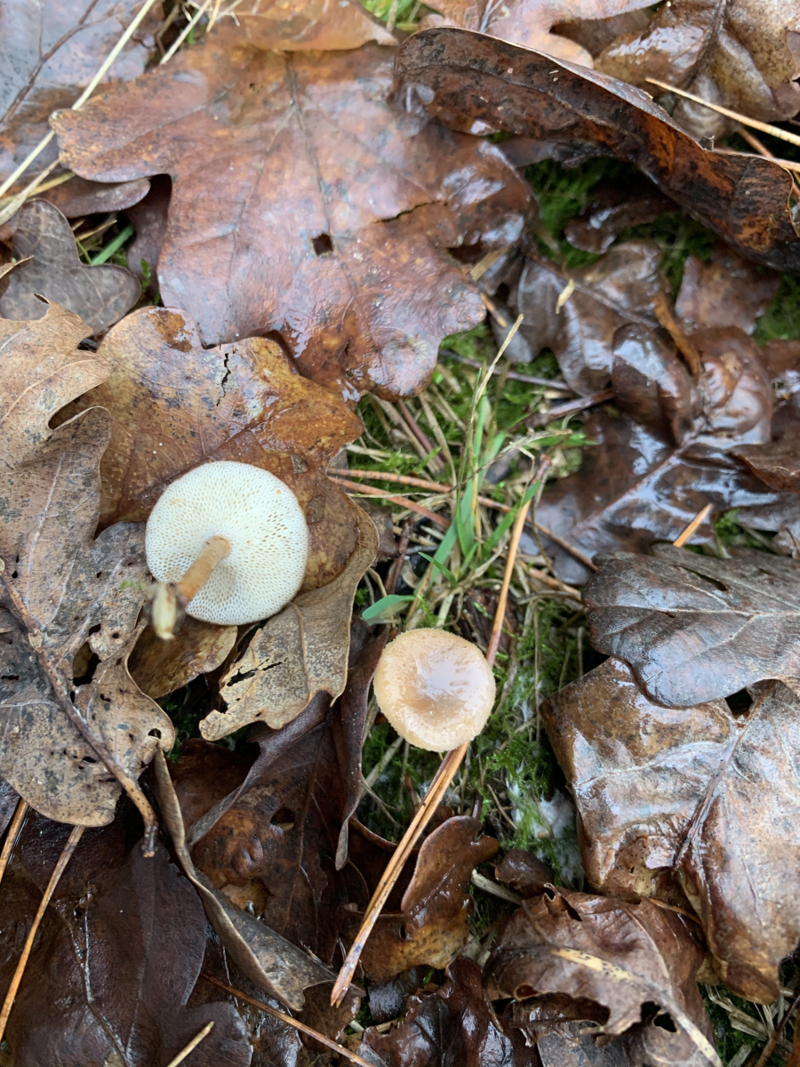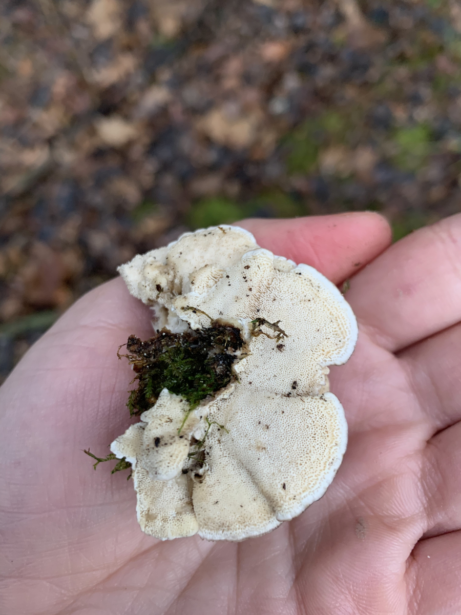 Der zähe mit der interessanten Unterseite ist ein Winter-Stielporling, Polyporus brumalis. Er wächst das ganze Winterhalbjahr an Laubholz und wird dann ab April /Mai vom Maiporling, P. ciliatus abgelöst.