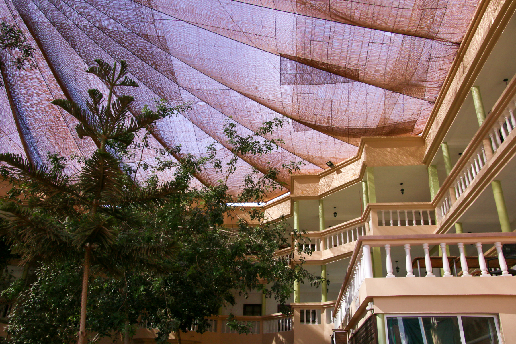 Das Hotel Barbas in zweistelliger Entfernung zur Grenze bietet keinen besonderen Standard, aber einen Unterschied von draussen nach drinnen wie Tag und Nacht. Über das ganze Gebäude ist ein riesiger Fallschirm gespannt: