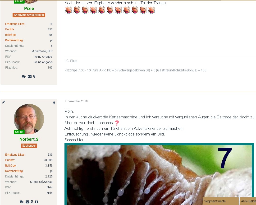 Angeregt dazu wurde ich durch Tuppie, die nicht nur im Forum, sondern auch im wahren Leben meine Schwester ist. Sie ist schon seit 2013 hier dabei und kennt sich mit Pilzen ziemlich gut aus.