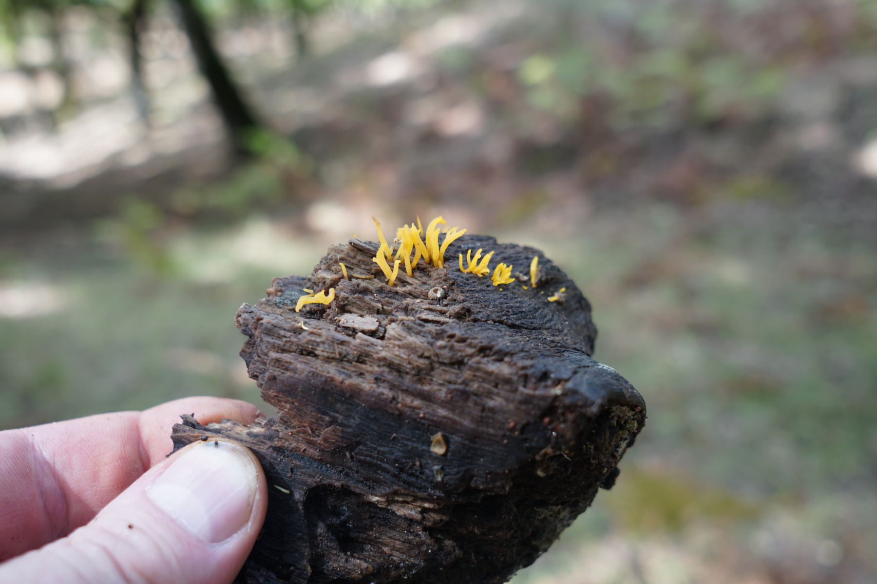 Auch an Holz, der Laubholzhörnling, Calocera cornea.