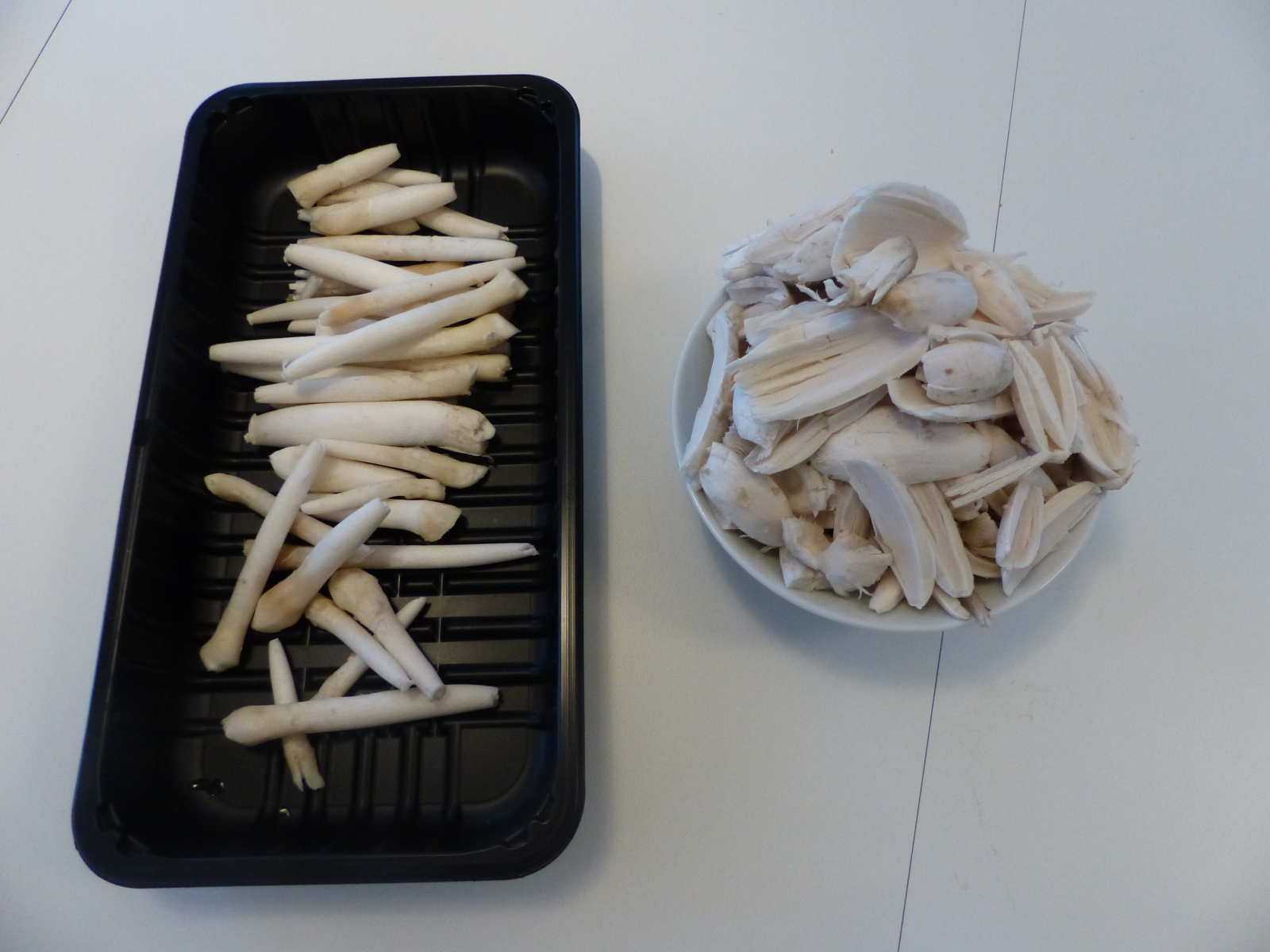Im Urlaub hat man ja immer viel Zeit, und da bin ich auf die Idee gekommen, die Stiele der Tintlinge getrennt vom Rest zu verarbeiten. Das Ergebnis beim Putzen sah dann so aus: