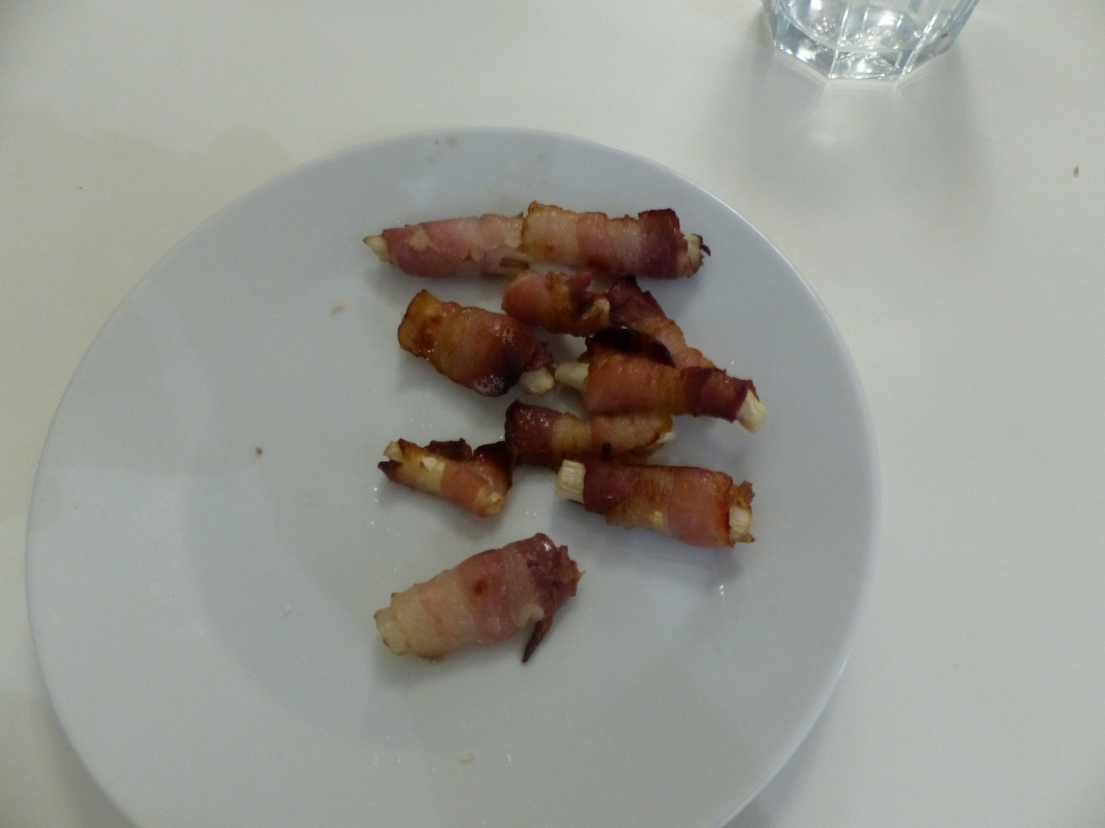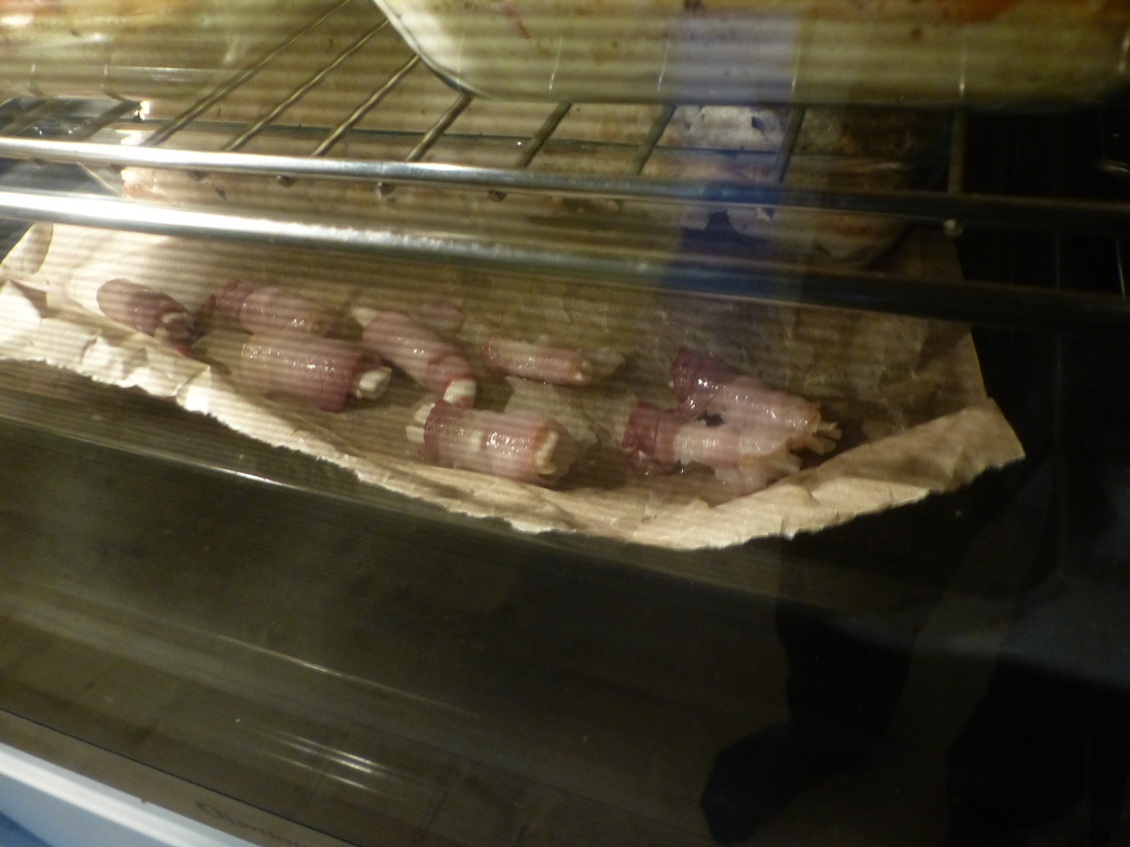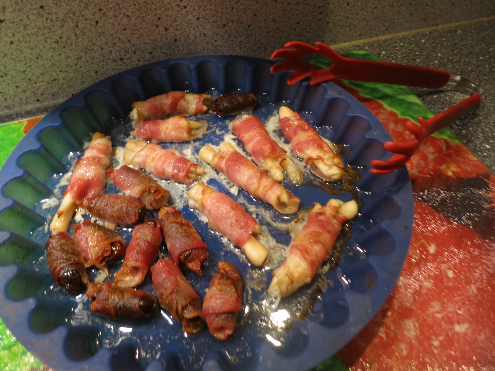 Die Stiele habe ich mit Speck umwickelt und 20 Minuten in den Backofen gelegt. Das sah dann so aus:
