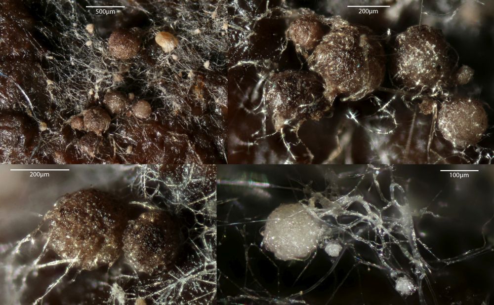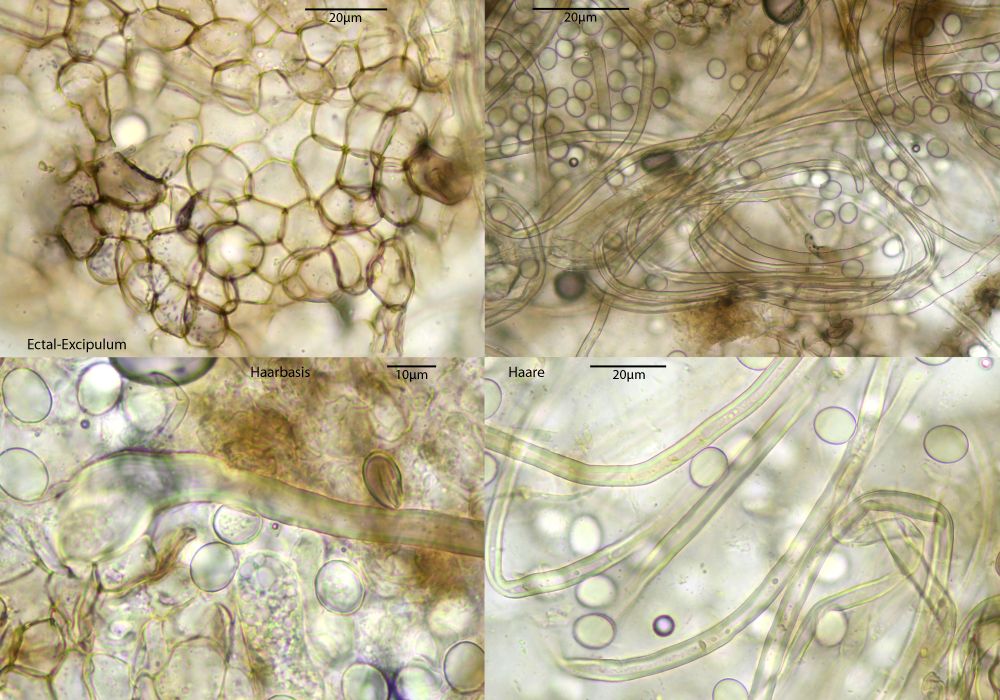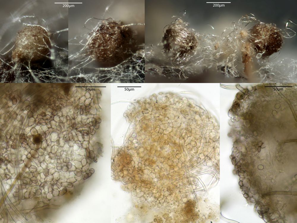 Auffällig auch, dass die Kugeln nahezu nicht mit dem Substrat verwachsen scheinen, nehme ich eine mit der Präpariernadel ab, hängt daran ein Haufen Filz und man zieht benachbarte Fruchtkörper nahezu ohne Widerstand gleich mit raus.