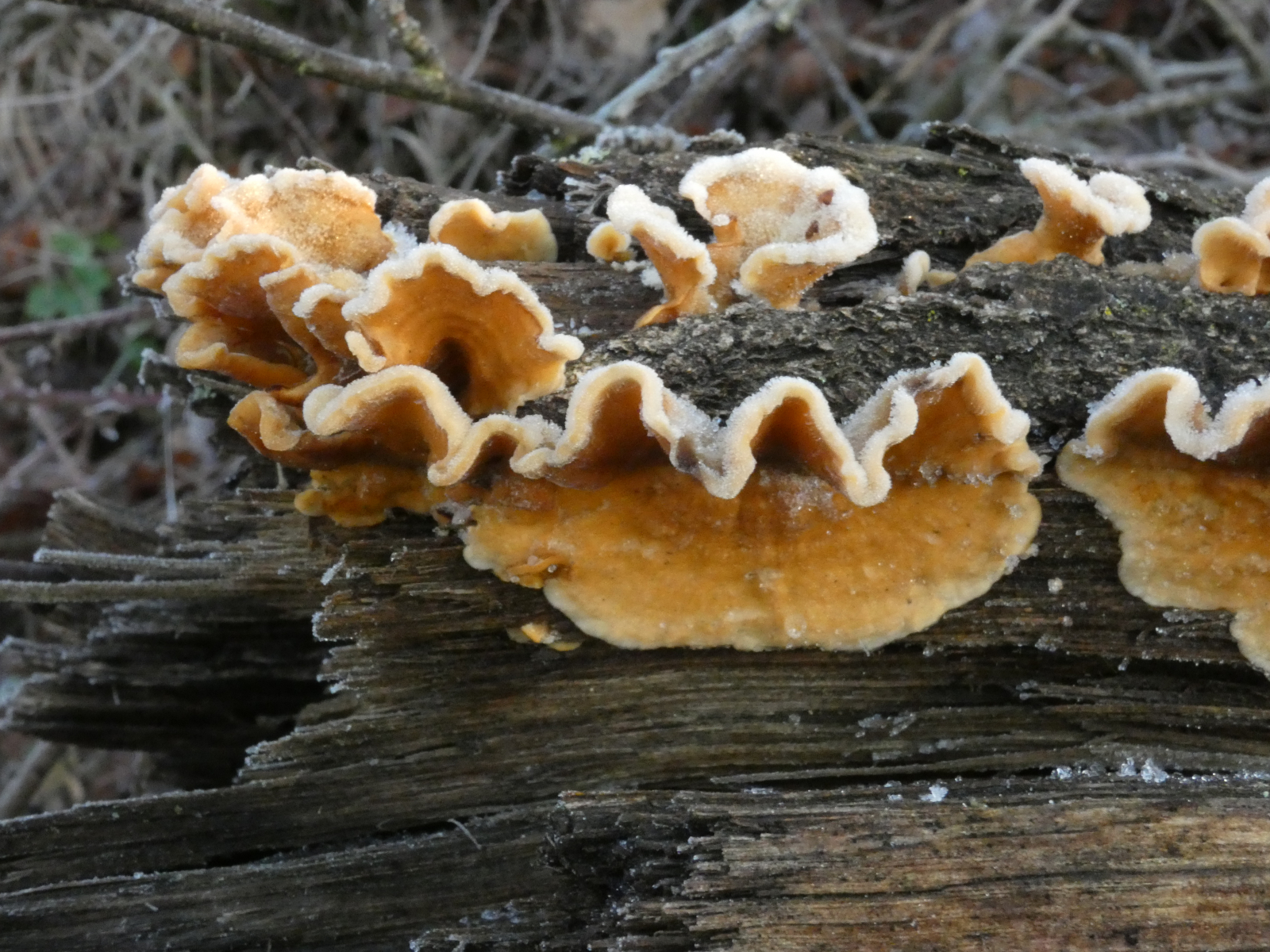 26.-29. EntzĂĽckendes PilzgerĂĽsche an einem Ast im Graben am Waldrand.