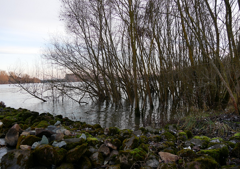 Das Rheinwasser steht noch ziemlich hoch und tränkt die Uferweiden, damit dort im Frühjahr herrliche