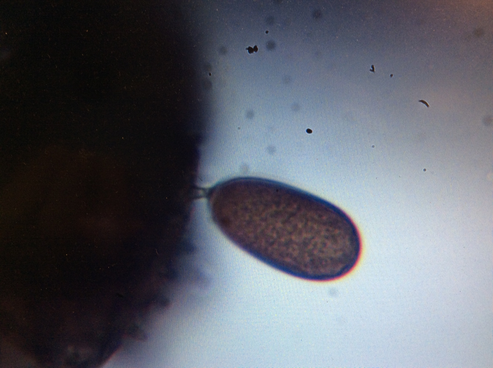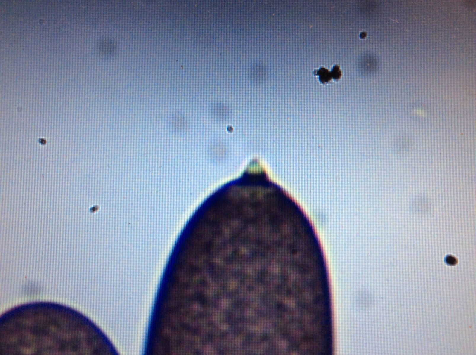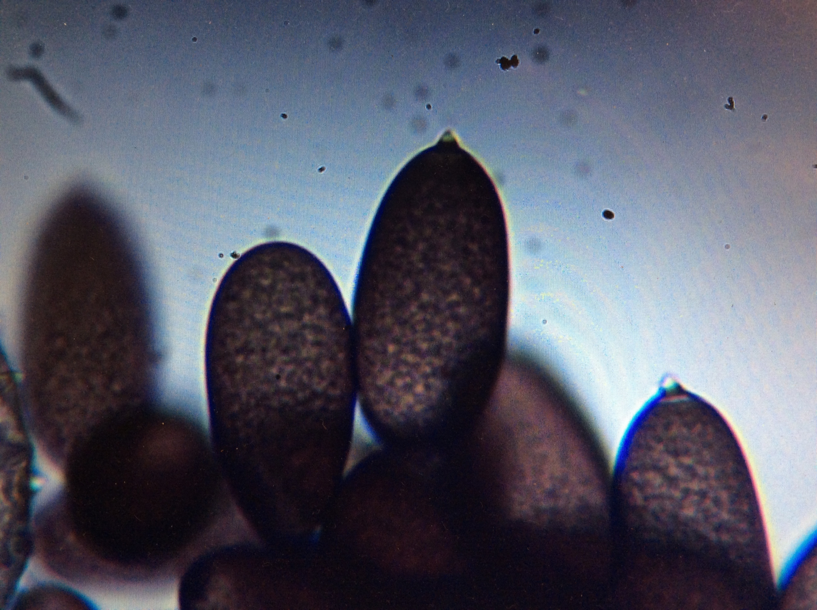 Sporangiophor 1 mm hoch, Vesicel 75 my, Sporen 45 x 20 my, Die Sporen sind braun, haben zum Zähnchen hin einen etwas helleren Hof, dann einen dunklen Bereich, wo dann das hyaline Zähnchen sitzt.
