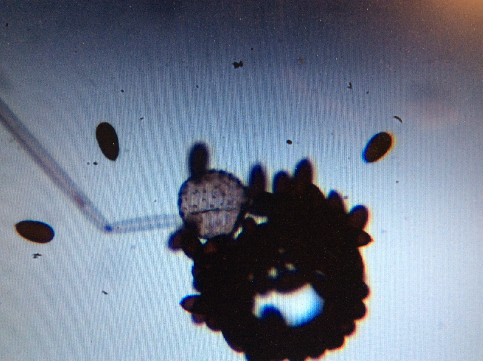 Nun heute ist doch was gekommen. Ich fand kleine Stielchen (ca. 1 mm hoch) mit braunen Sporenköpfchen, die mich an Aspergillus niger erinnerten. Unter dem Mikroskop dann aber die Überraschung! Das Ding ist unseptiert - also ein Zygomycet. Der Pilz ist aber nicht verwandt mit Mucor oder Pilobolus, da die dunklen und riesigen Sporen auf Zähnchen stehen. Des Rätsels Lösung fand ich dann bei Ellis und Ellis in den „Microfungi On Miscellaneous Substrates“: Rhopalomyces elegans
