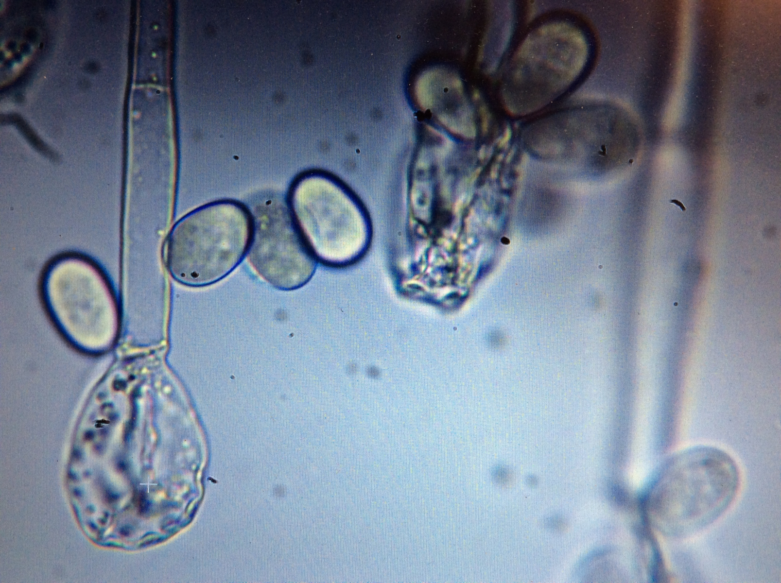 Auf Hinterlassenschaft vom Damwild ist mir ein Imperfekter aufgefallen. Weißes Mycel aus dem auf dünnen Stielchen weiße Köpfchen stehen. Das Conidiophor ist septiert. An der Spitze findet sich eine Vesikel mit kleinen Zähnchen, auf denen die Sporen gebildet werden. Die Sporen etwas eiförmig 16-18 my groß. Dabei ist am „spitzen“ Ende kein Zähnchen zu sehen. Wenn es hier nicht noch weitere Arten auf Dung gibt, dann sollte das Oedocephalum glomerulosum sein.