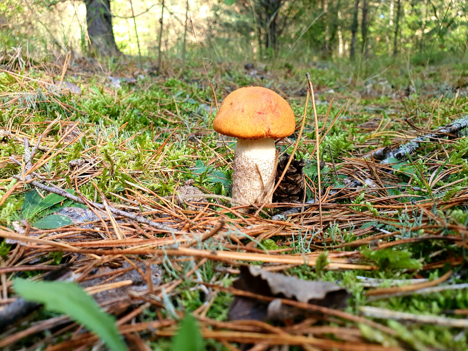 Nach ein paar Metern der Erste Birkenpilz, dann paar Ziegenlippen und Rotfüße, der erste Steinpilz. Mittendrin war eine kleine abgemähte Wiese. Dort sah ich etwas Weißes, was ich für einen Bovist hielt, war aber nur Müll. Dann stand da eine kleine Reihe Espen und Birken und das erste rote Köpfchen war zu erkennen.