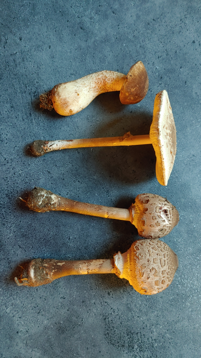 4 Parasole und ein Birkenpilz.
