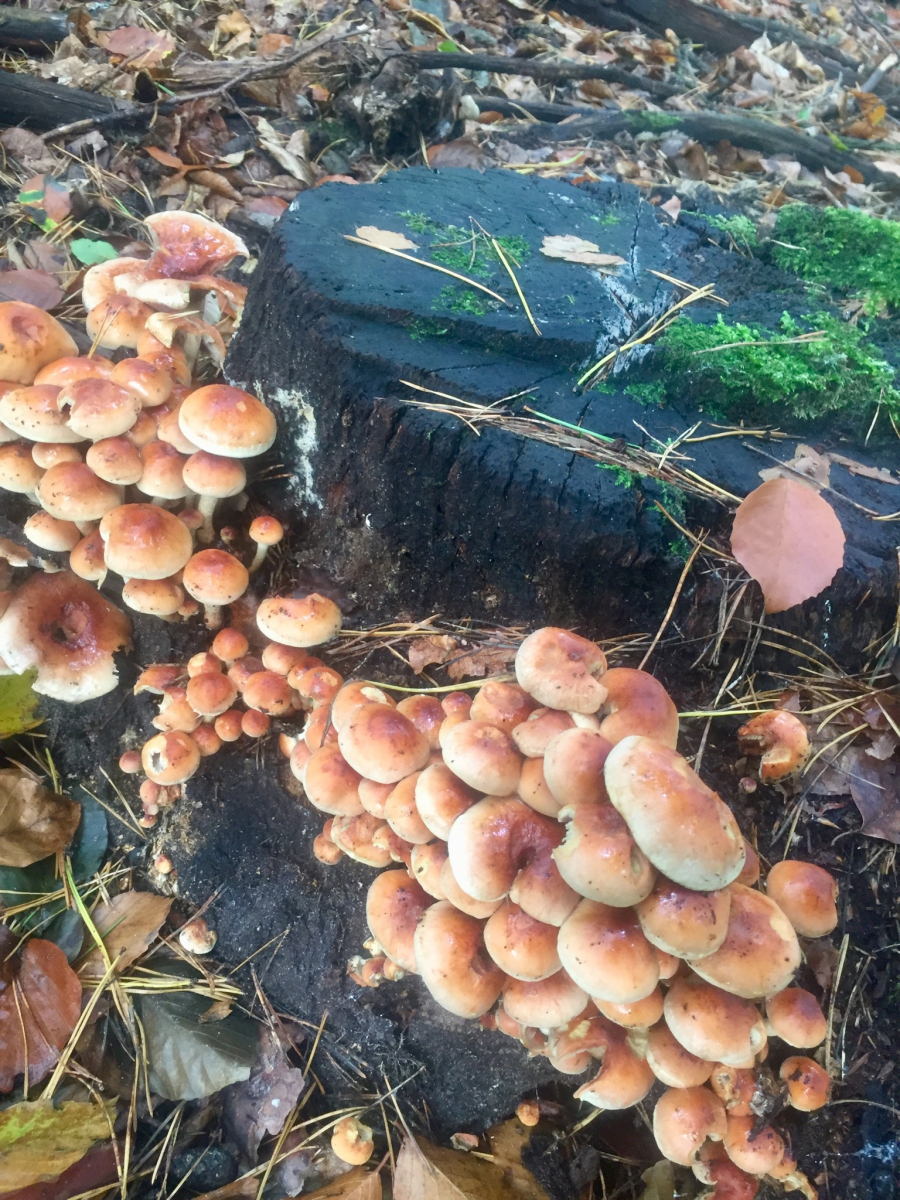 Massenhaft Knollenblätterpilze und Unmengen von diesen orange-gelbe-braunen "Massenbaumstumpfpilzen", deren Name mir gerade nicht einfällt.