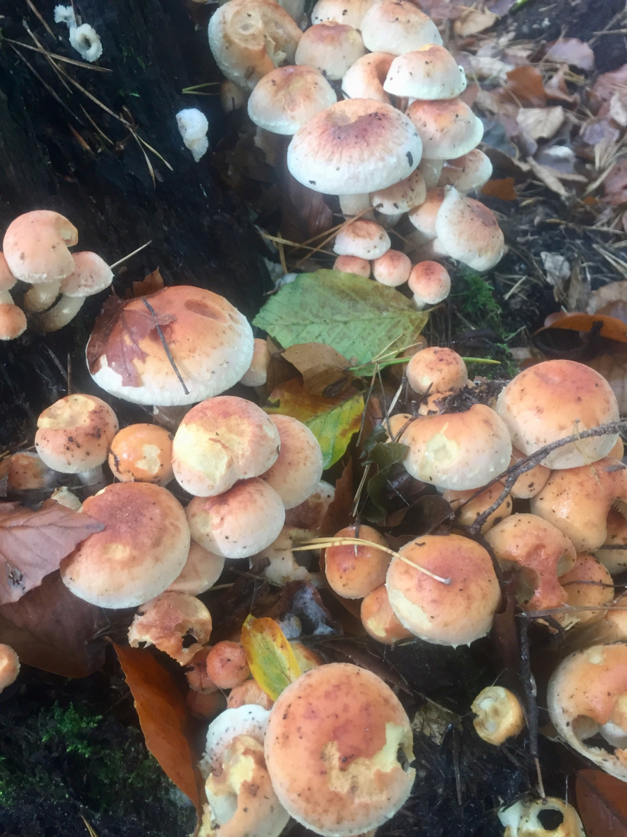 Massenhaft Knollenblätterpilze und Unmengen von diesen orange-gelbe-braunen "Massenbaumstumpfpilzen", deren Name mir gerade nicht einfällt.