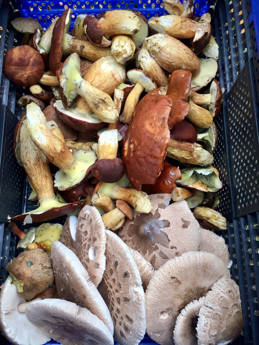 bei mir im Revier sieht's gerade aus, wie in einer gut sortierten Pilzausstellung. Zum Verputzen nehme ich aber kaum was mit. Höchstens mal sowas Rotes wie hier im Korb.