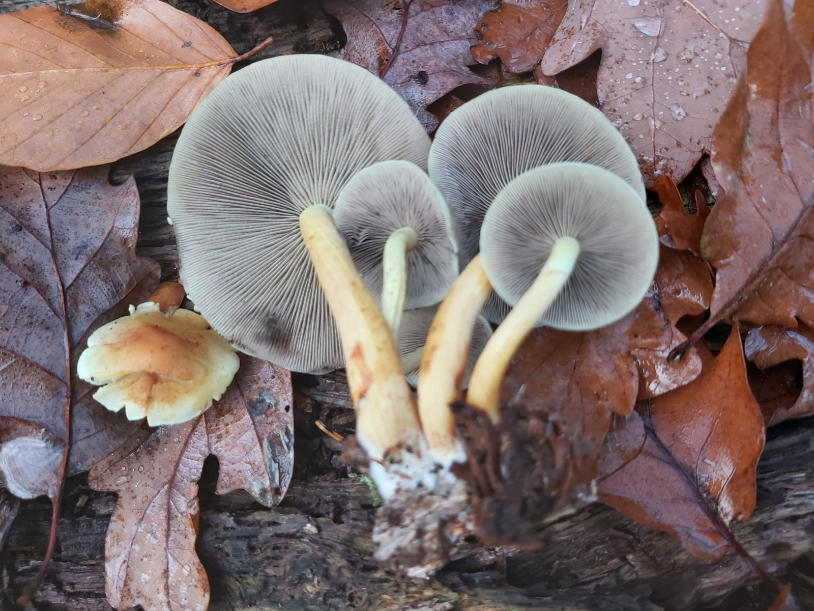 Winterpilze hab ich keine gesehen. Bei den Saitlingen bin ich mir nicht sicher. Lamellen in den Stiel übergehend, unauffälliger Geruch. Ich hab aber keine abgemacht zur genauen Bestimmung.