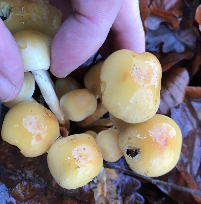 • Leider habe ich keine weiteren Bilder gemacht, da ich der Meinung war, er sei einfach zu identifizieren. Rückblickend ein Fehler. Auffallend war sein intensiver Schleim (Frostschutz?). Ich tippe auf Samtfußrübling oder Stockschwämmchen. Ich habe aber auch entdeckt, dass diese mit dem Gifthauptling verwechselt werden können.