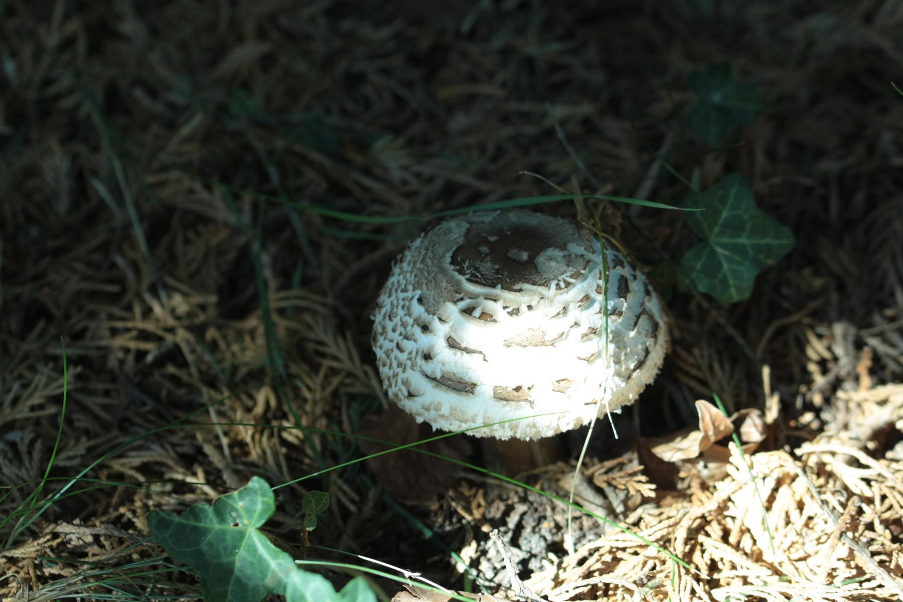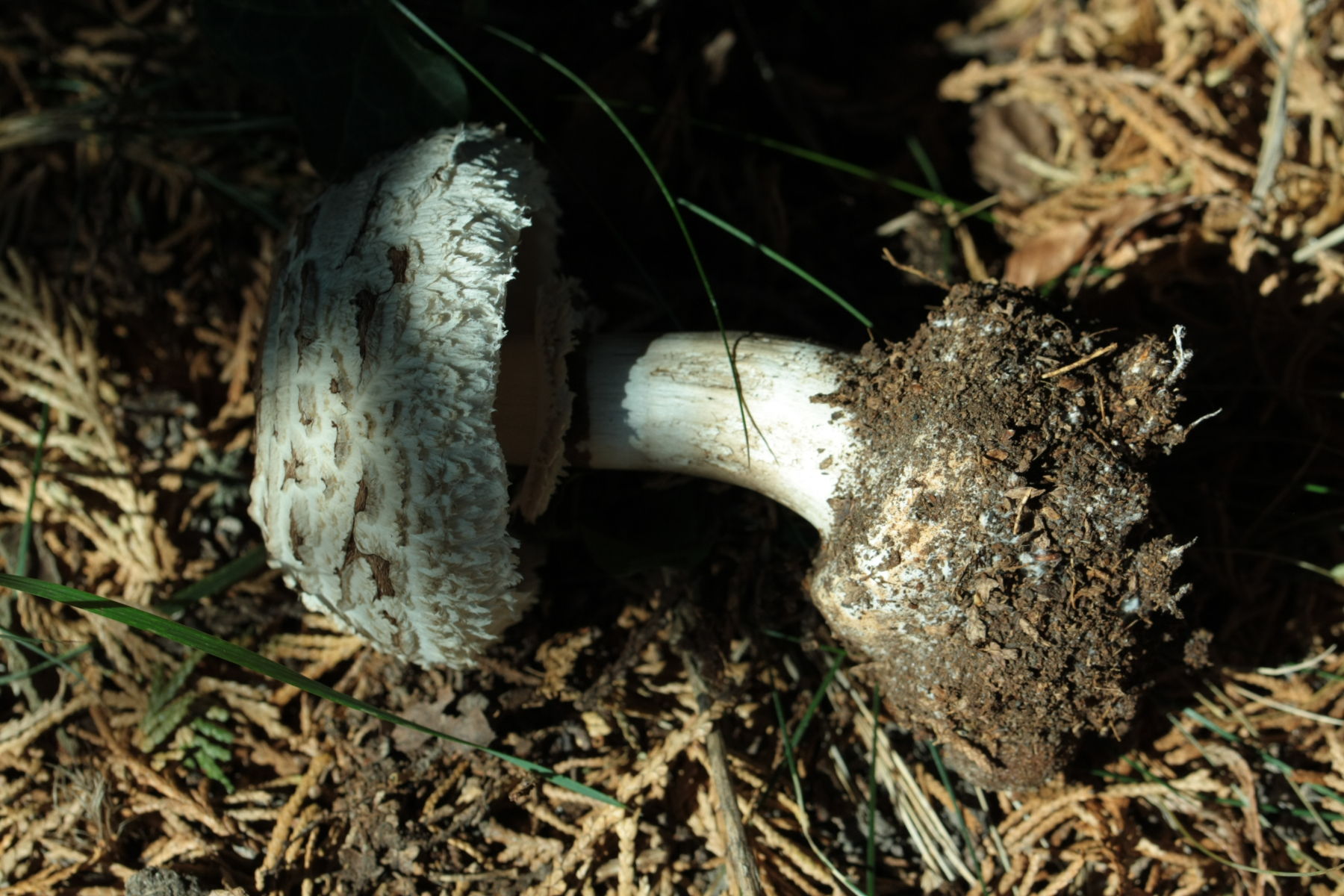 Da gibt es nun aber auch noch den giftigen Gerandetknolligen Garten-Safranschirmling, Chlorophyllum brunneum. Der hat sich inzwischen gut verbreitet auf dem Gelände.