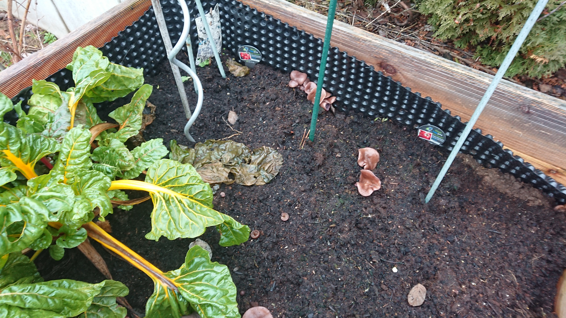 Diese Pilze habe ich heute bei einem winterlichen Rundgang durch den Garten in unserem Hochbeet entdeckt. Könnt ihr mir sagen, welche das sind? Falls sie giftig sind, muss ich dann die Erde austauschen...?