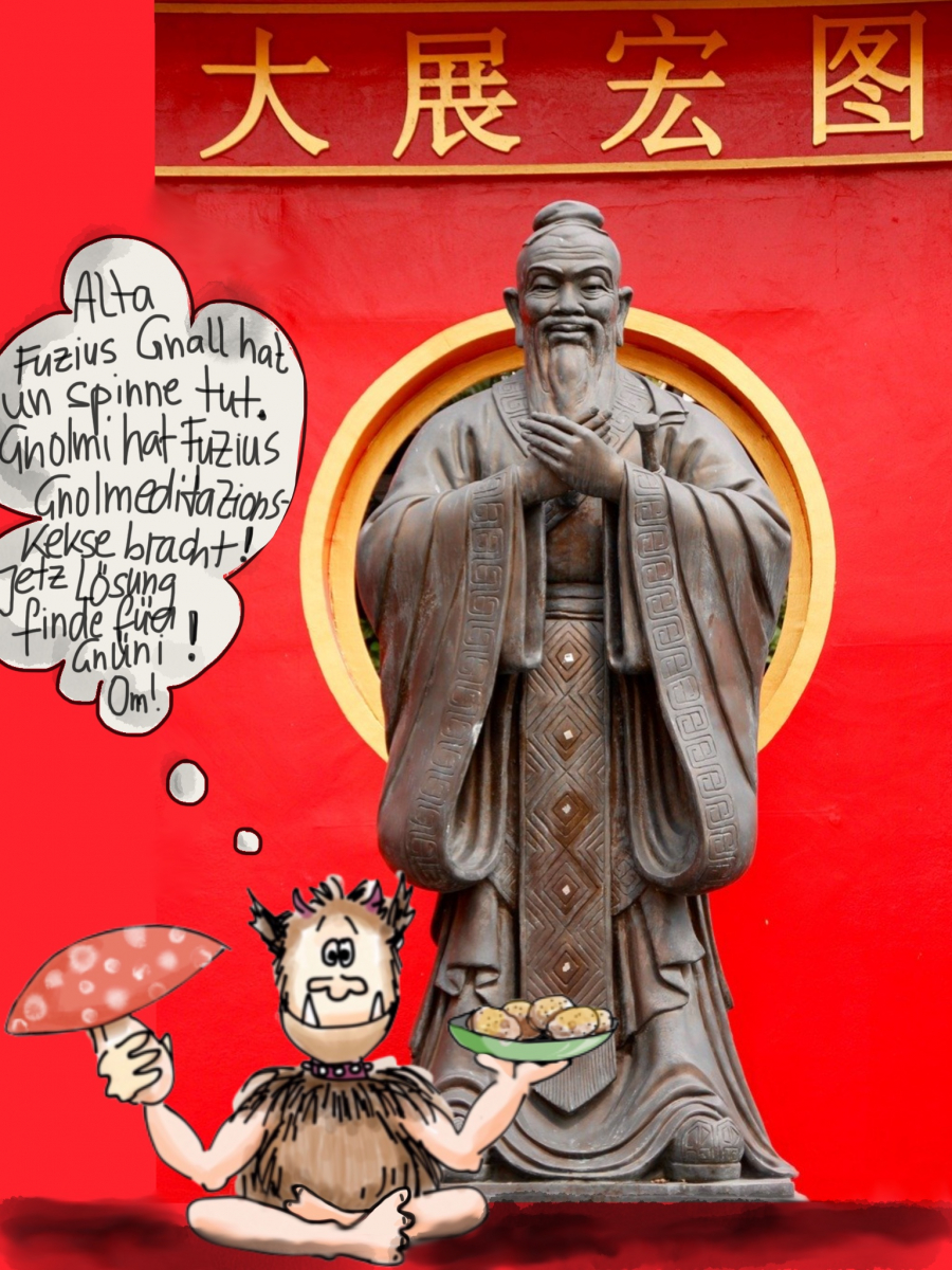 21. Grünis Gnolmfuzius-Bild mit dem Gnolm-Hinweise "Konfuzius - konfus - fusipes; spinnt - spindelig --> Spindeliger Rübling (19);