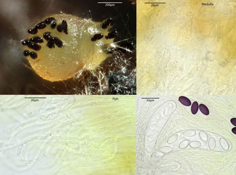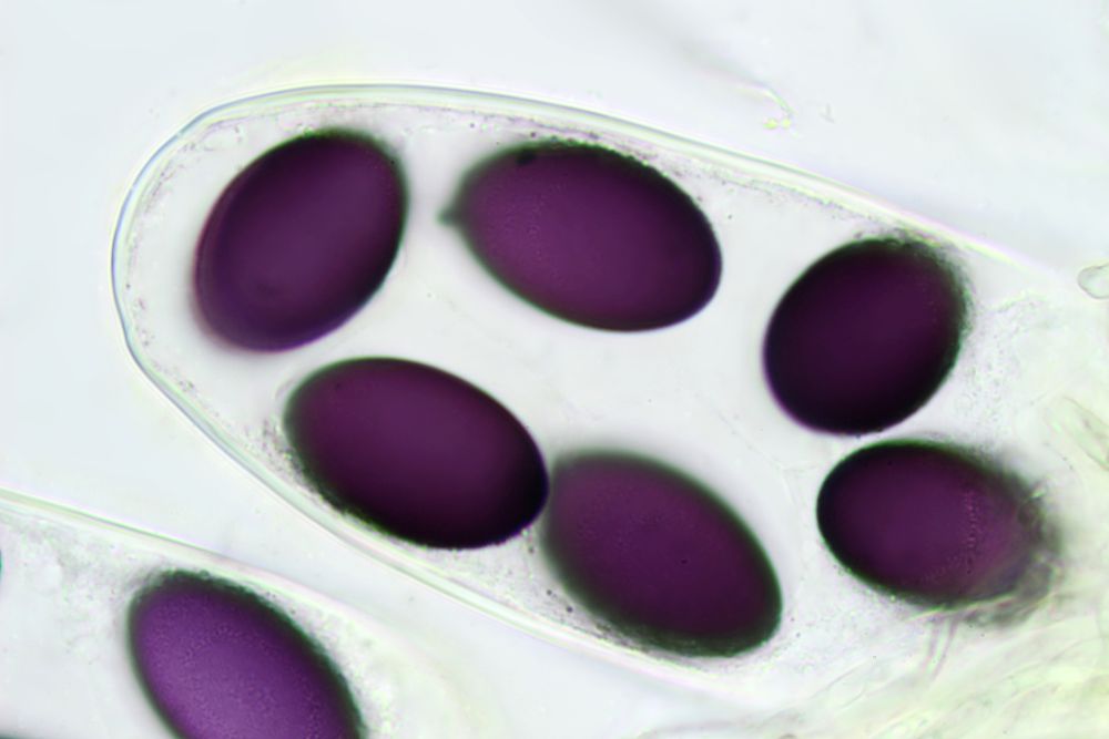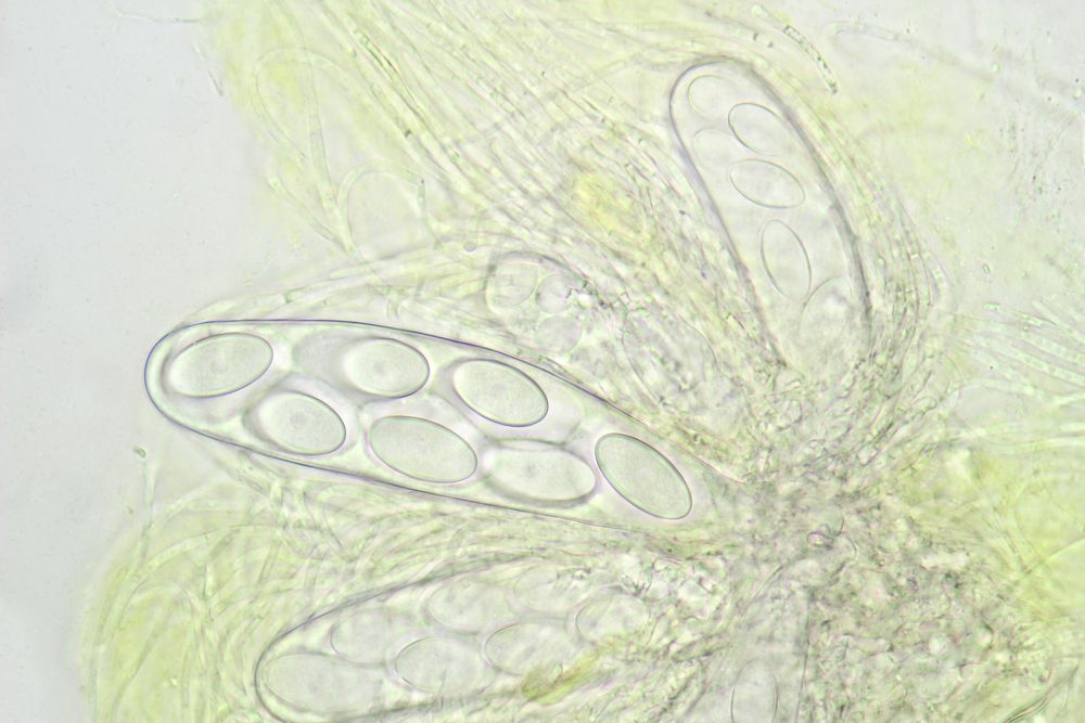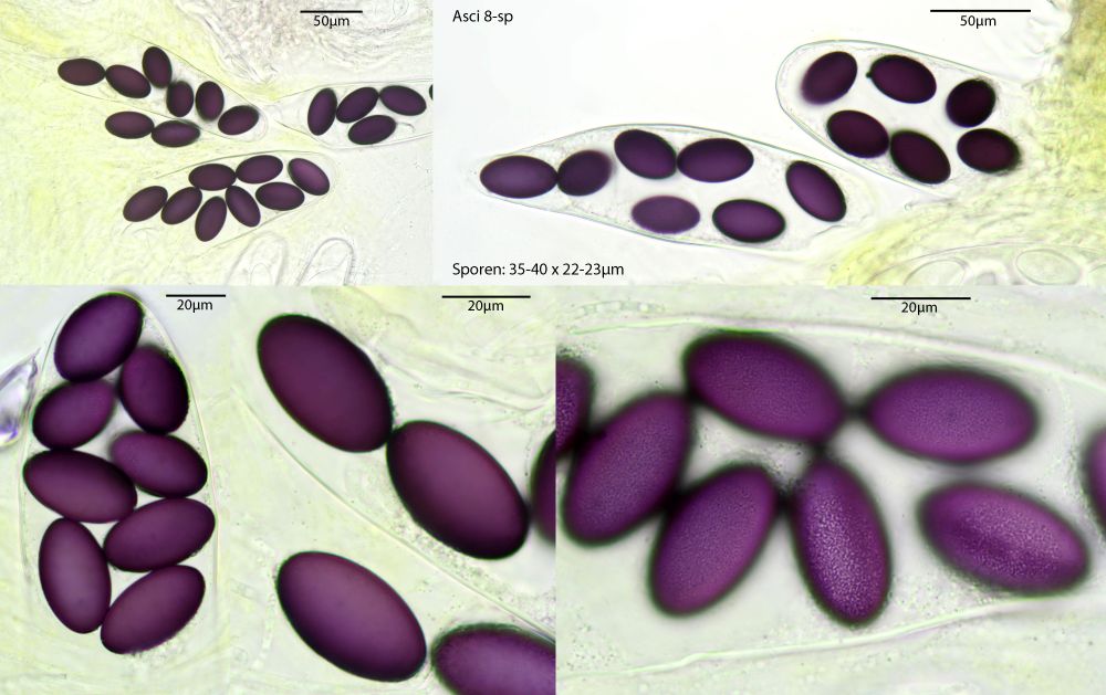 Und meine sind nun 35-40 × 22-23µm, wobei es bei manchen Exemplaren bei Sporen im Ascus bei 37 losgeht. Freie Sporen scheinen wieder etwas kleiner, aber von Breiten von 16-18 bin ich meilenweit entfernt, auch bei freien Sporen aus Eikes Zusendung. Wiederum passen Eikes Maße genau in die Mitte zwischen den anderen Autoren und meinen.