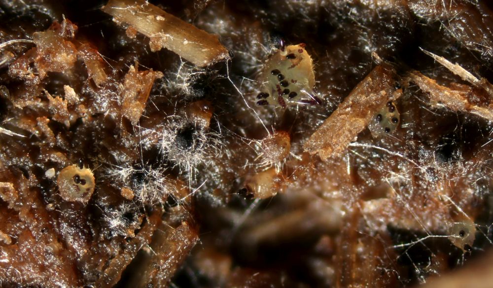 Und an den Zebra-Proben ist noch viel mehr dran. Eine Sordaria, die ich noch bestimmen muss, bildet daran Massen von Fruchtkörpern, der ganze Zebra-Apfel ist gespickt davon.