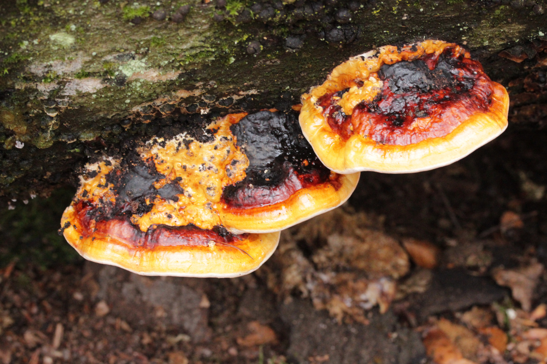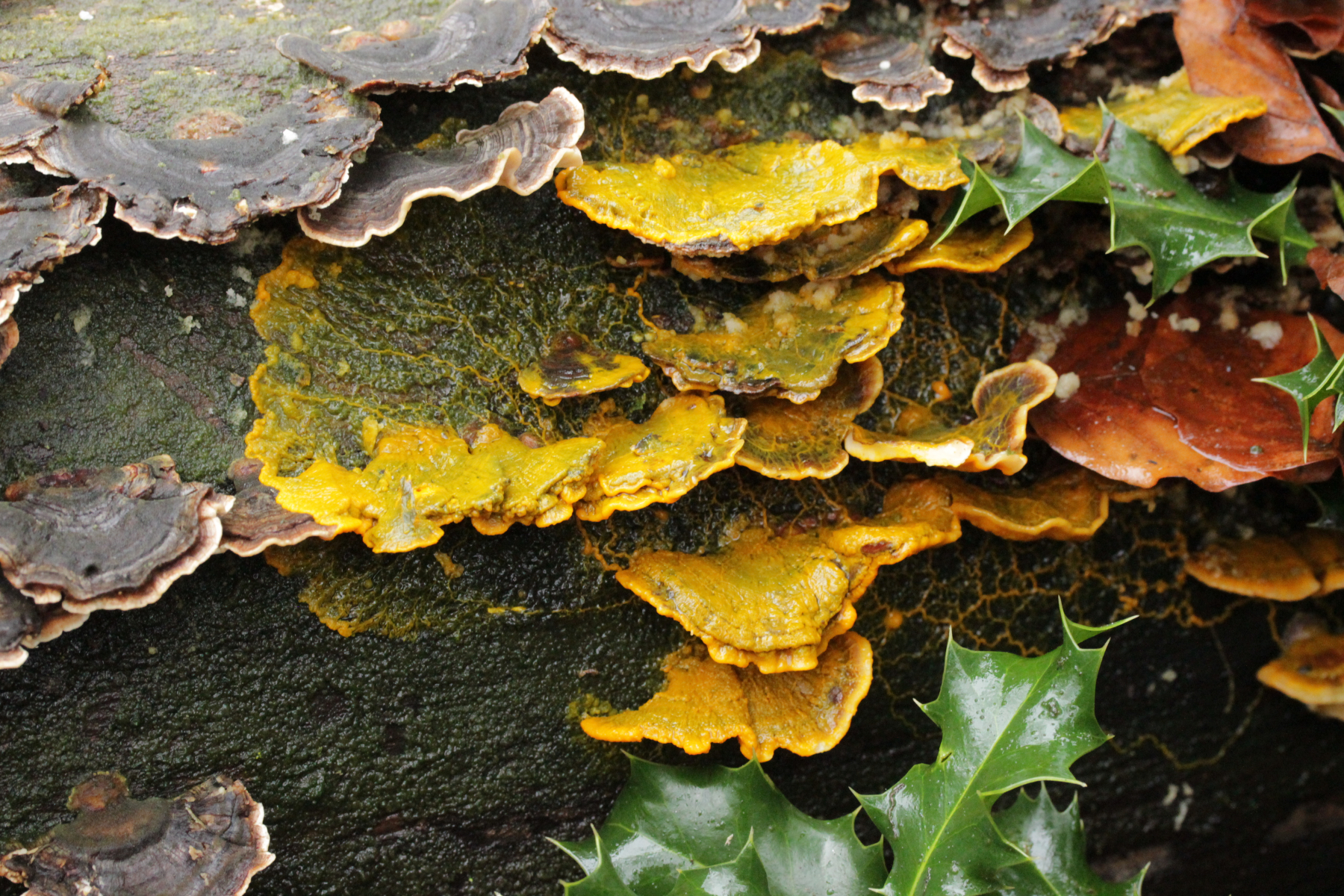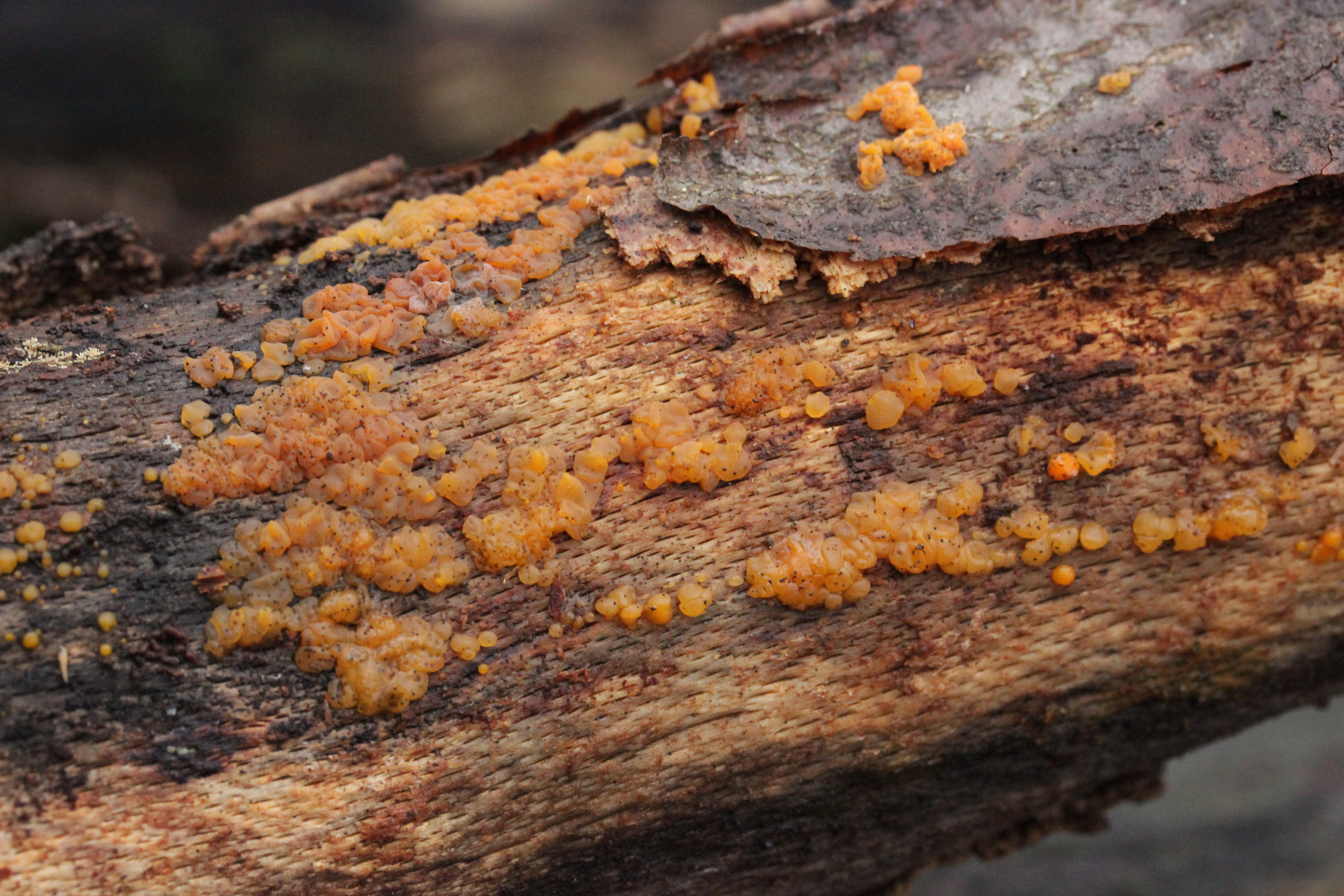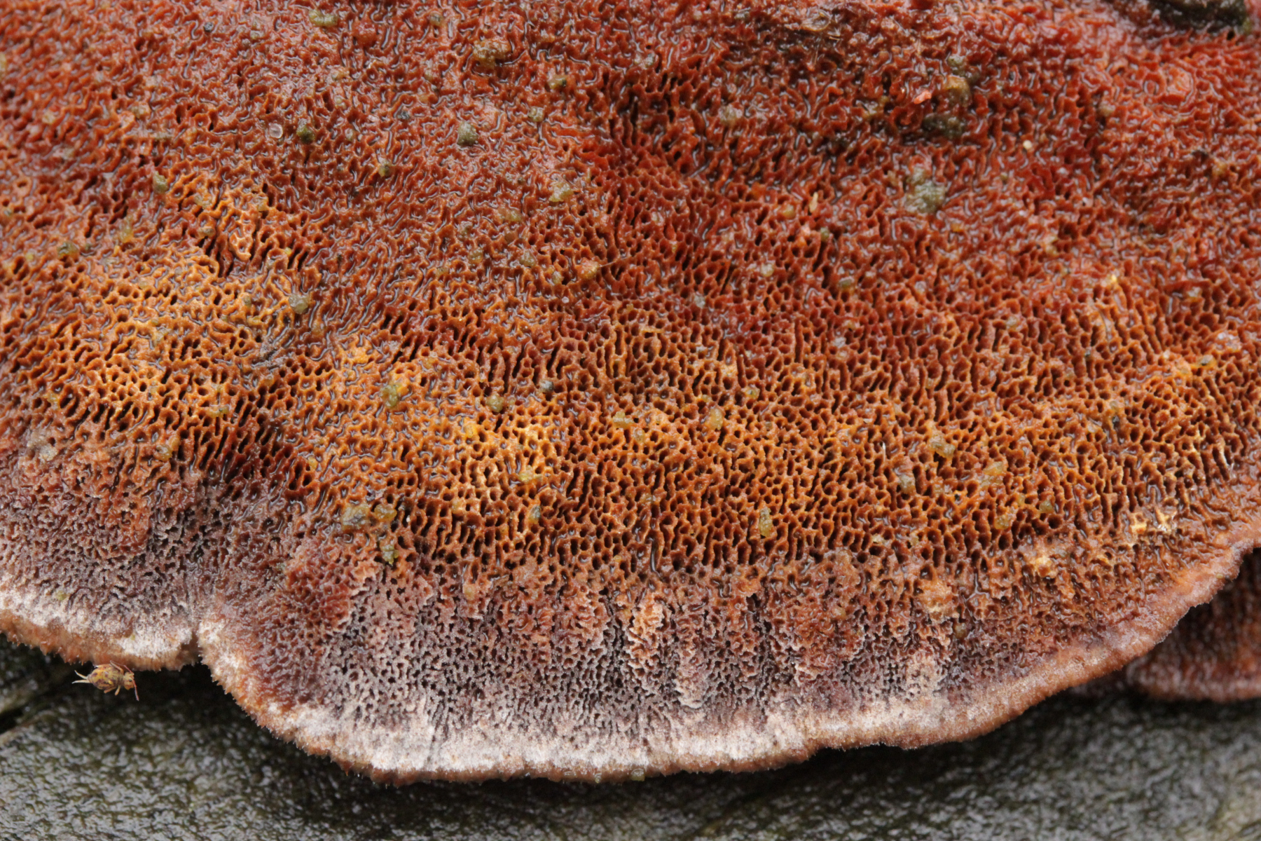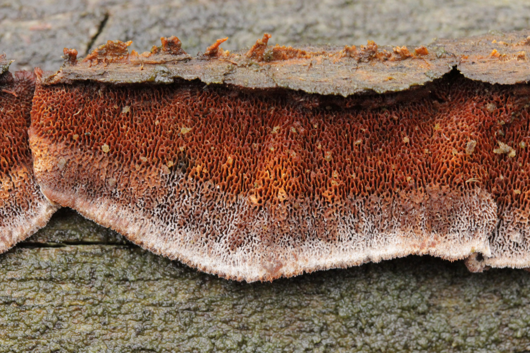 Der Schleim an der Tramete ist möglicherweise Badhamia utricularis, der mag nämlich Porlinge zum Fressen gern.
