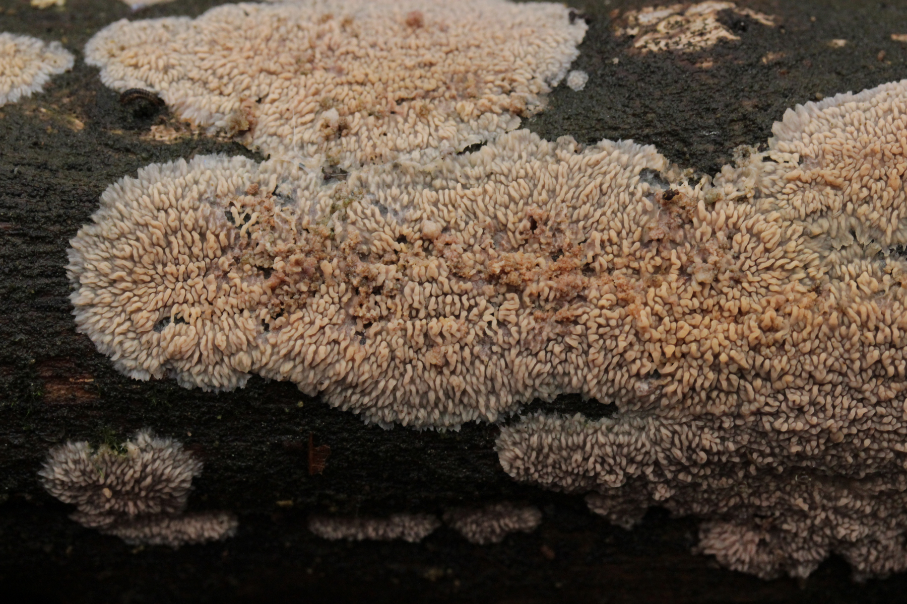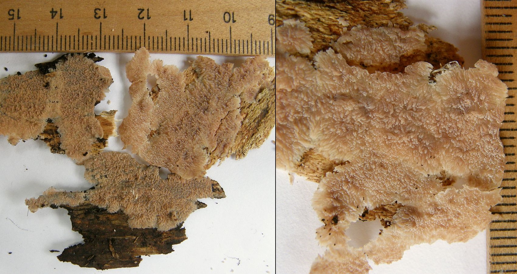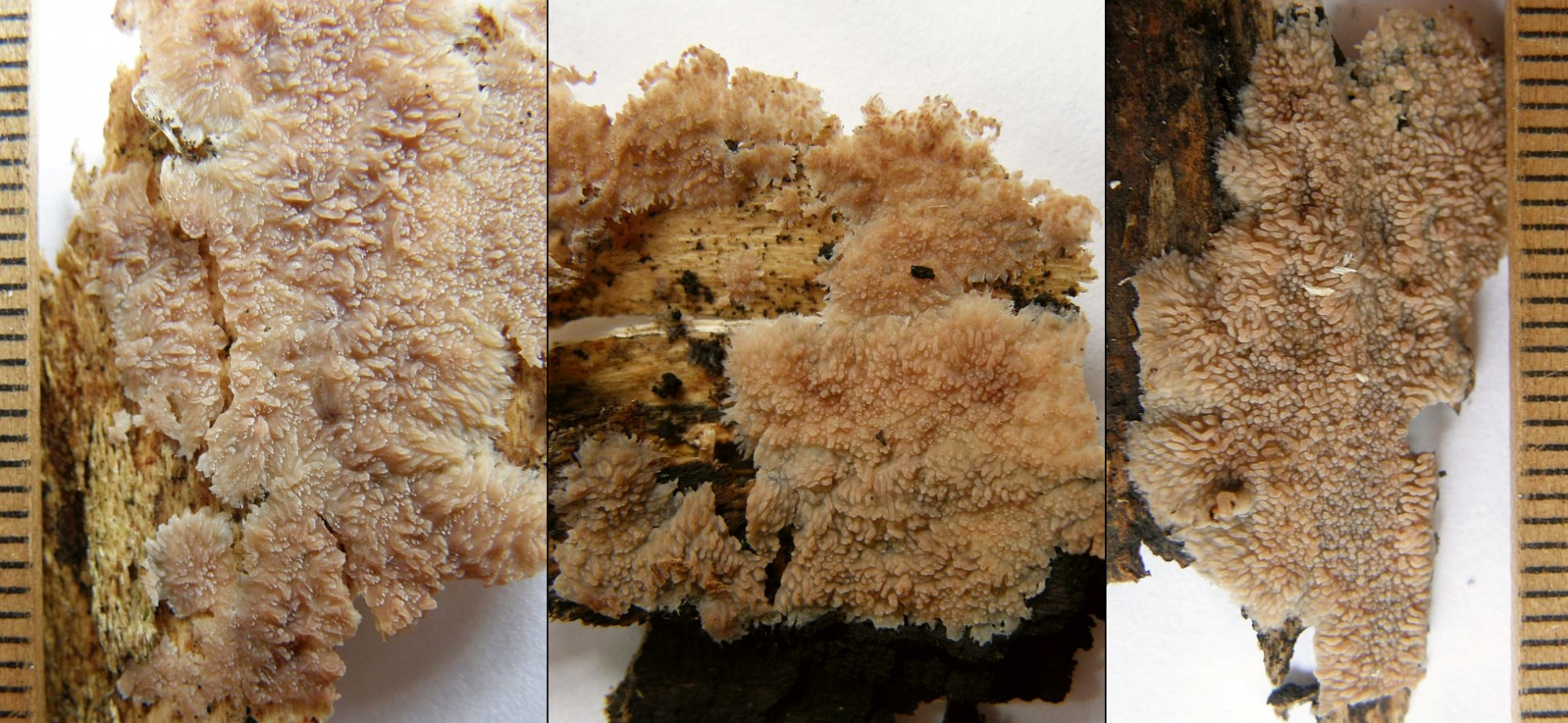 Ob diese komisch strukturierten, blassen (oft komplett ohne orangetöne) Winterkollektionen von Phlebia radiata vielleicht sogar was Eigenes sein könnten, das müssen Genetiker klären - wobei in der ITS wohl keine Abweichung zu finden ist, die eine Trennung auf Artebene rechtfertigen würde.