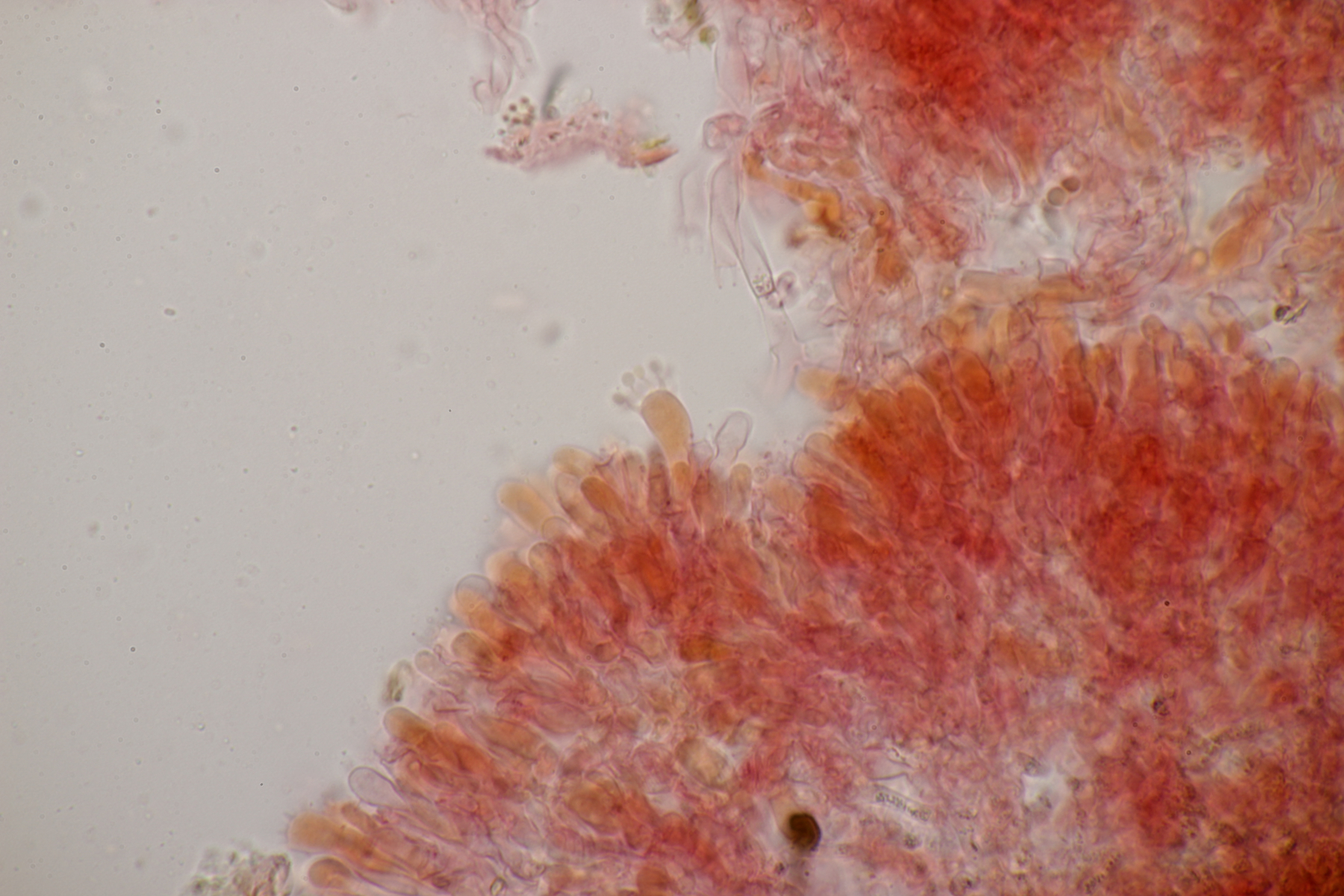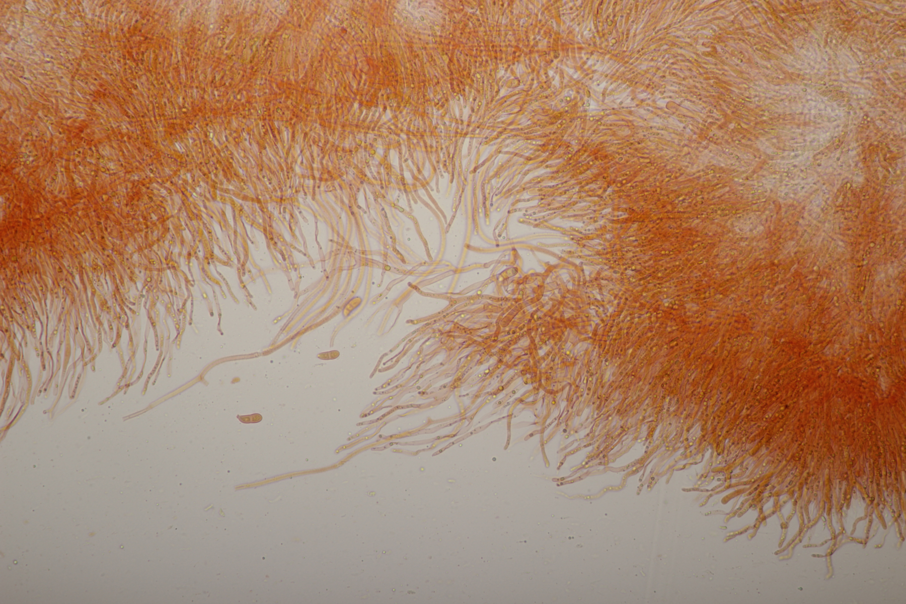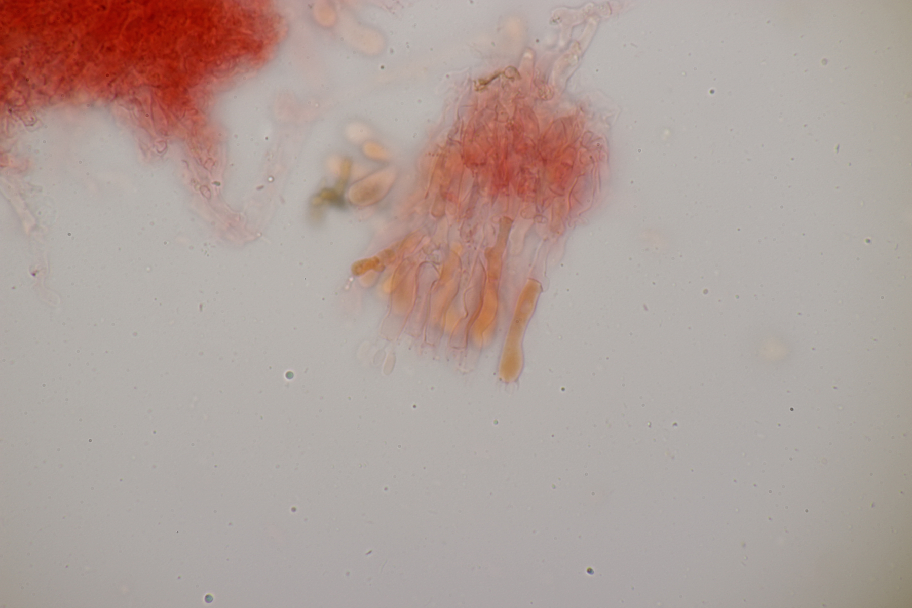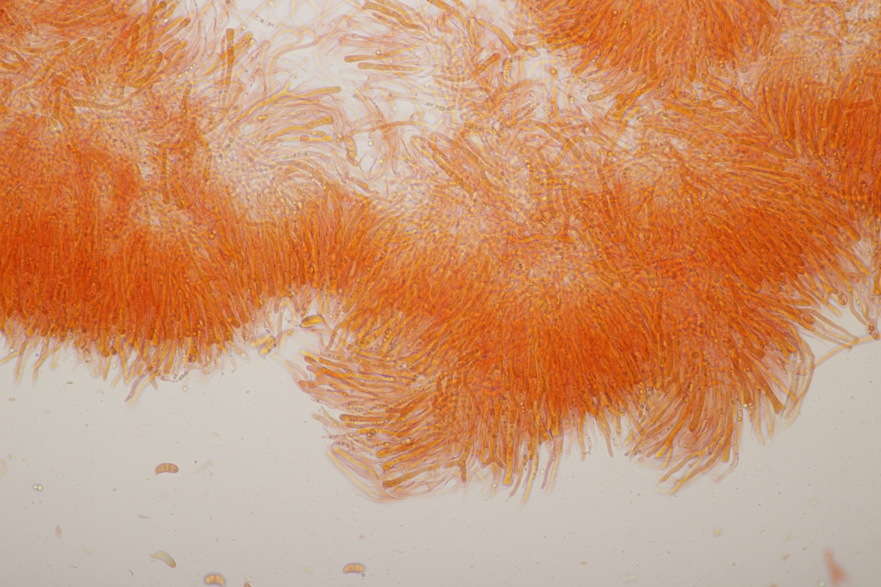 Problem am Rande: Phlebia radiata und Phlebia rufa sind halt mikroskopisch nahezu identisch. Am ehesten erkennt man noch einen Unterschied bei Zystiden, die bei Phlebia rufa nach meinen Beobachtungen tendenziell fetter, breiter, insgesamt größer und oft auch zahlreicher sind.