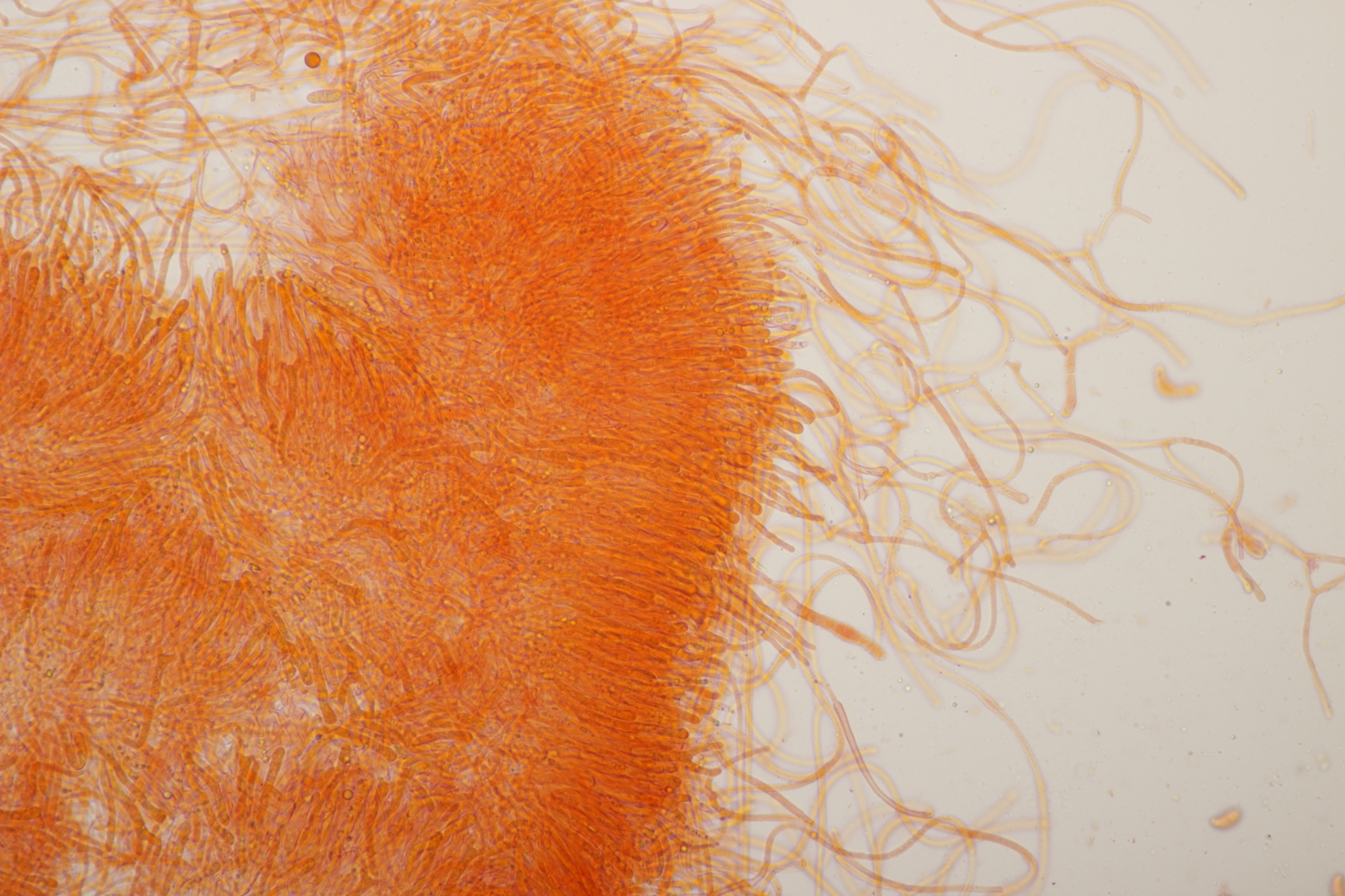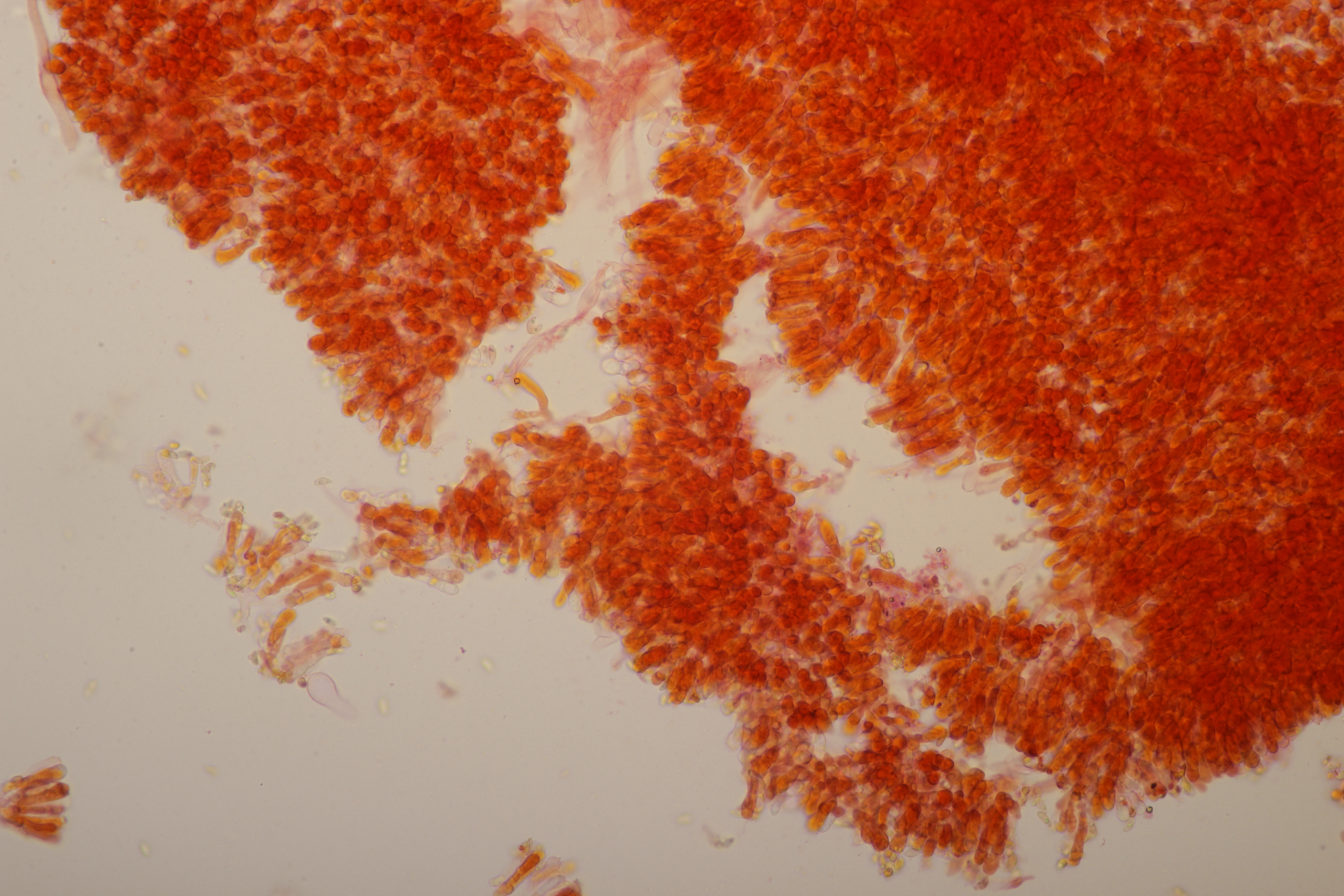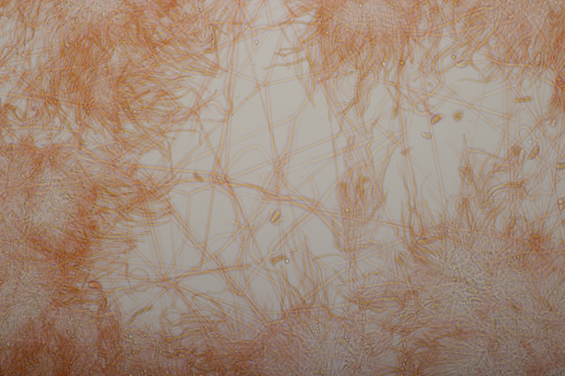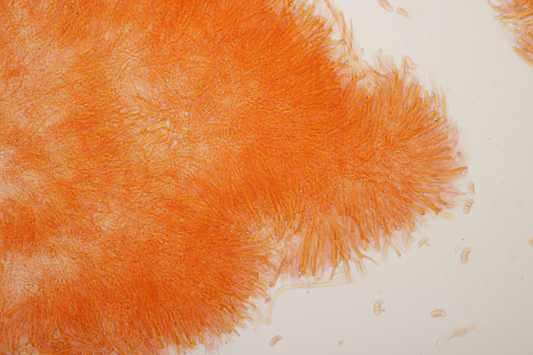Problem am Rande: Phlebia radiata und Phlebia rufa sind halt mikroskopisch nahezu identisch. Am ehesten erkennt man noch einen Unterschied bei Zystiden, die bei Phlebia rufa nach meinen Beobachtungen tendenziell fetter, breiter, insgesamt größer und oft auch zahlreicher sind.