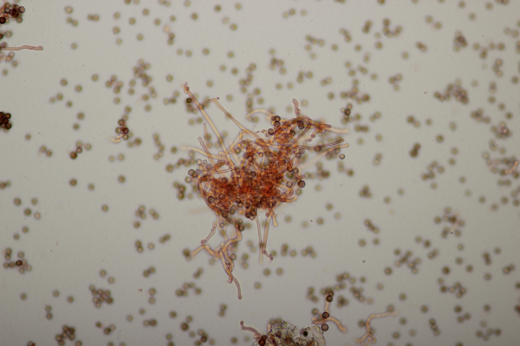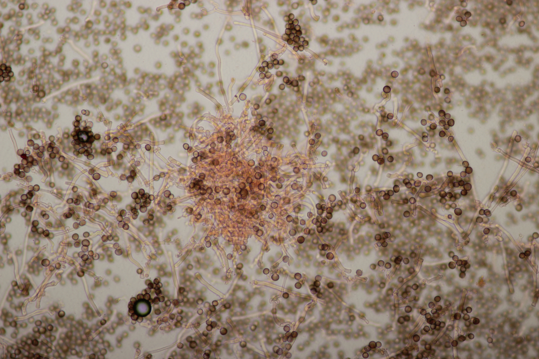 4. Dacrymyces stillatus. Warum sind die Sporen im Abwurf (da sollten ja die reifen Sporen sein) nicht oder kaum septiert und im normalen Präparat schon?