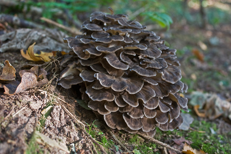 das sieht mir schon sehr nach Grifola frondosa ( Klapperschwamm ) aus. Die dunkle Farbe und die fächerförmigen Hütchen lassen meines Erachtens keine andere Bestimmung zu.