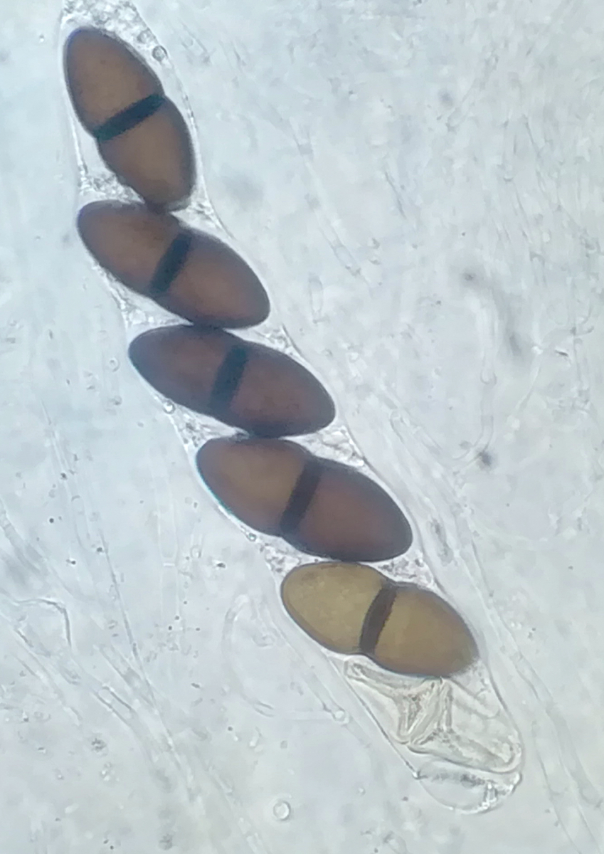 Makroskopisch sind oft nur die Perithecienmündungen durch das Substrat zu erkennen, beim Wühlen finden sich dann aber dann relativ große Perithecien. Manchmal schiebt sich allerdings auch der Perithecienhals recht weit aus dem Substrat (Abhängig von Licht oder Alter?). Die Perithecien weisen kein Tomentum auf. Mikroskopisch zeigen sich uniseriate Asci mit Sporen, die von hyalin bis hin zu fast schwarz abreifen. Die Sporen sind septiert und leicht eingeschnürt, die Septierung, sowie die Keimspalte ist gerade. Die Sporenmaße betragen 42 - 55 x 16 - 22 µm und passen damit perfekt zu den Maßen, die Luck-Allen & Cain angeben! Kurioserweise hatte Spegazzini, der Beschreiber der Art die Sporenmaße damals mit 35 x 16 µm angegeben. Luck-Allen & Cain konnten damals bei der Untersuchung des Holotypus keine so kleinen Sporen finden.